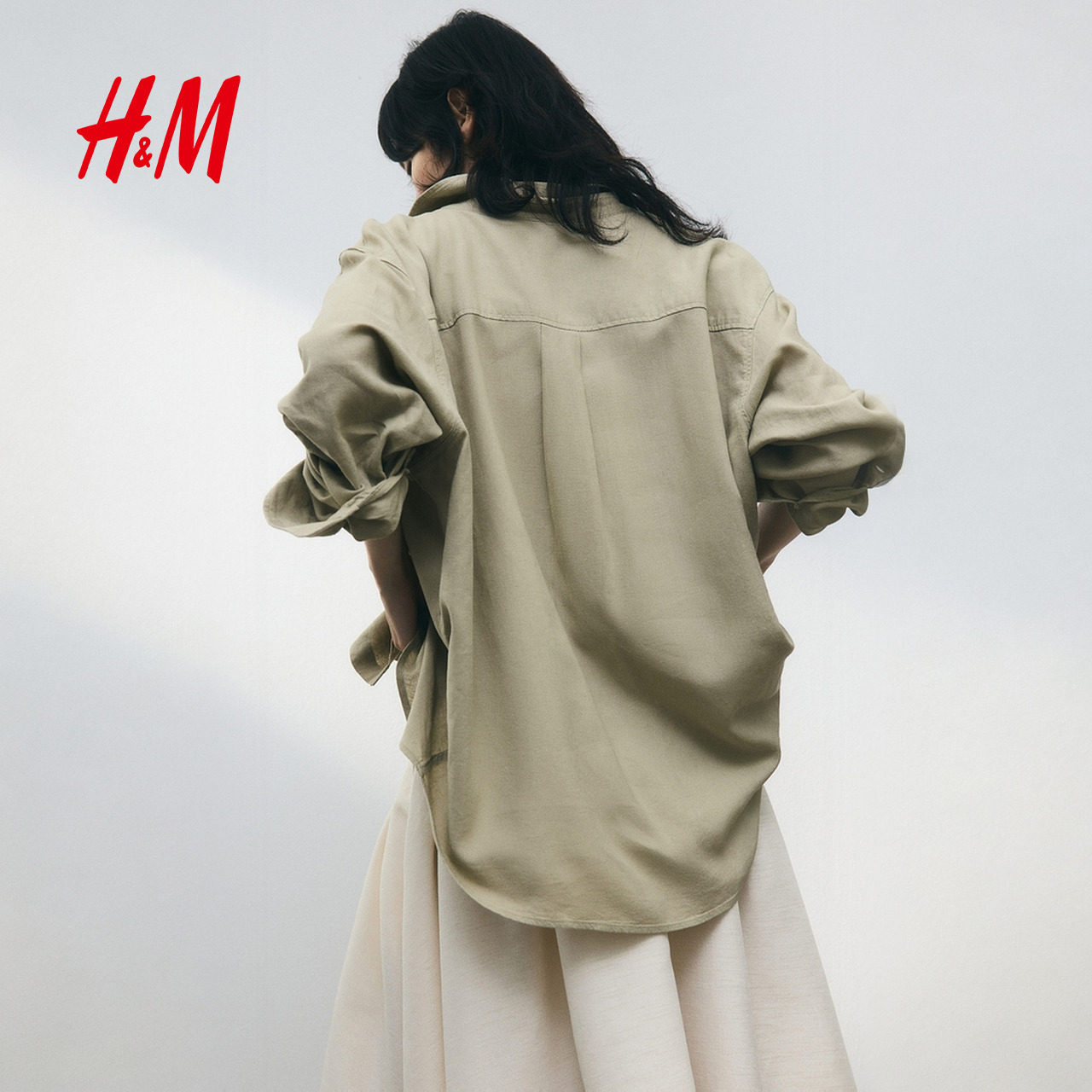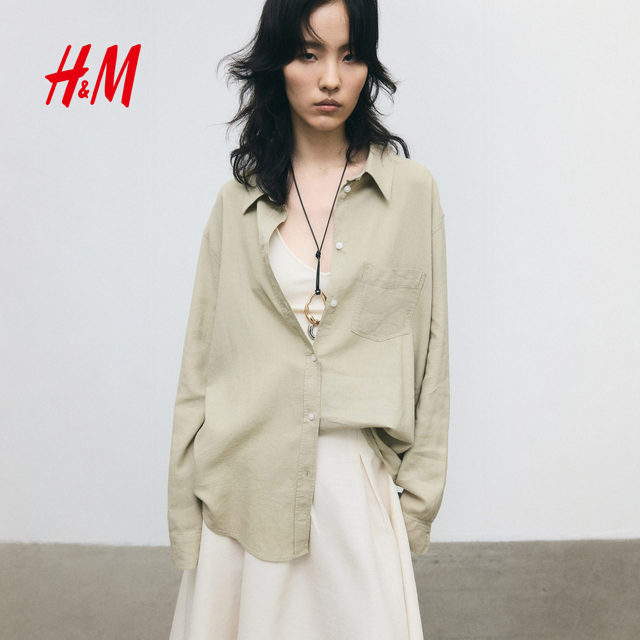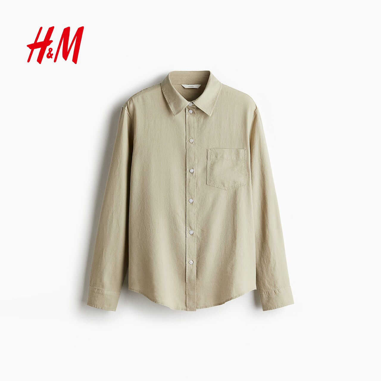 HM女装春季翻折领亚麻混纺衬衫休闲舒适上衣1213682