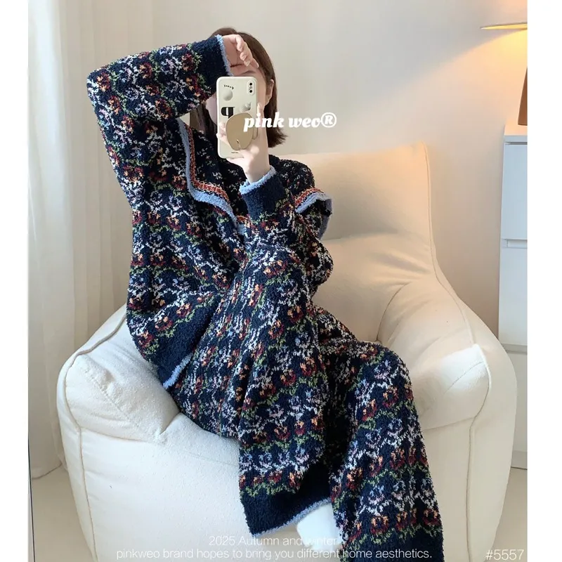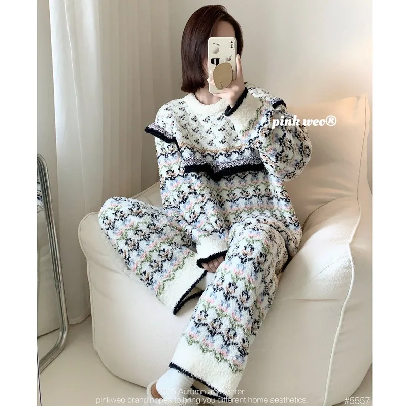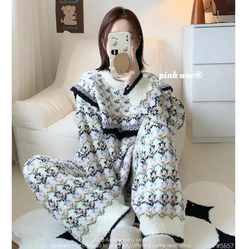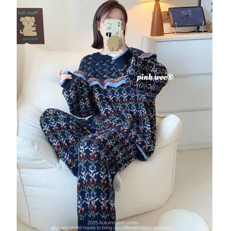 PinkWeo秋冬新款加厚软绵绵半边绒复古风休闲宽松居家服女士睡衣