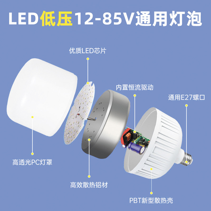 led灯节能灯12v24v36v48v低压灯泡E27螺口交直流工地电瓶太阳能灯