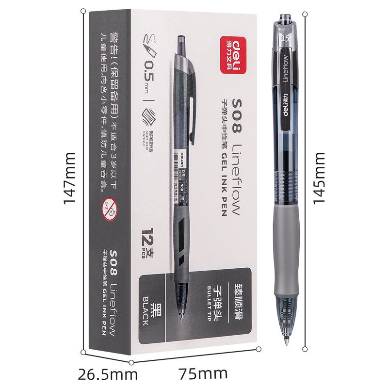 【12支装】得力S08臻顺滑中性笔按动碳素笔子弹头0.5mm圆珠笔水笔