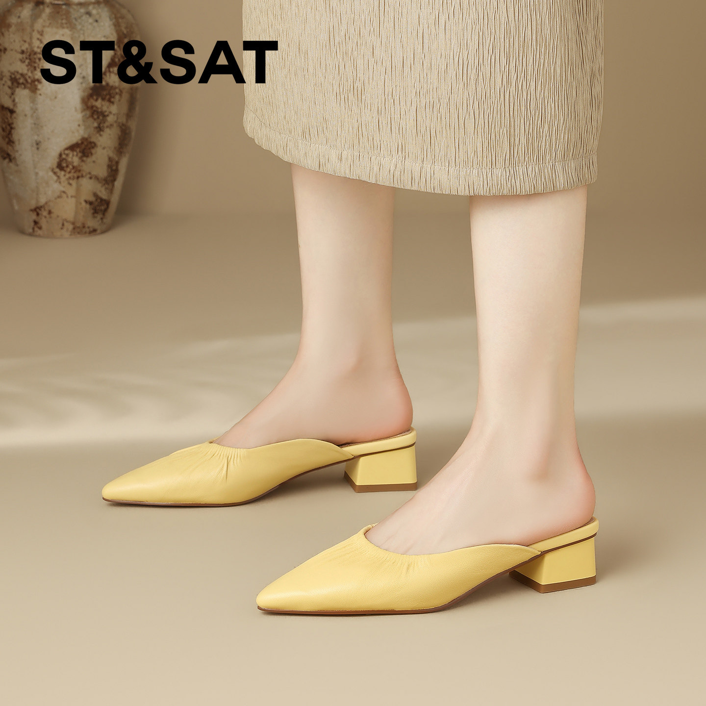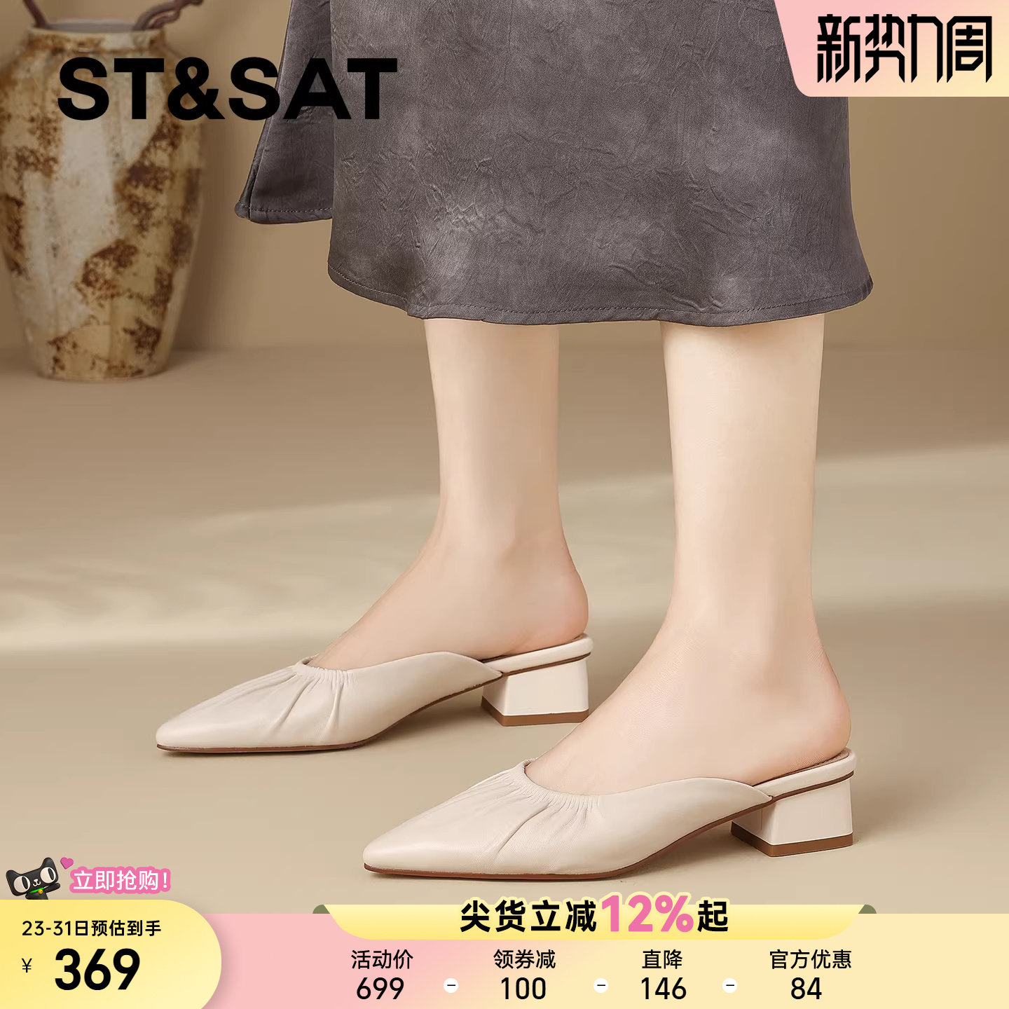 星期六气质真皮包头拖鞋女2026年夏季新款尖头粗跟中跟懒人一脚蹬