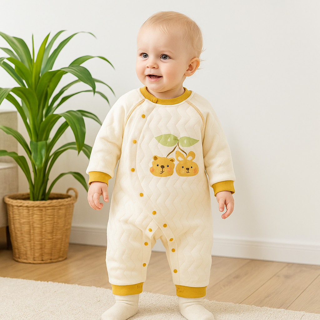 小猪大卫新生儿秋季保暖连体衣男女宝宝卡通印花中开夹棉爬服