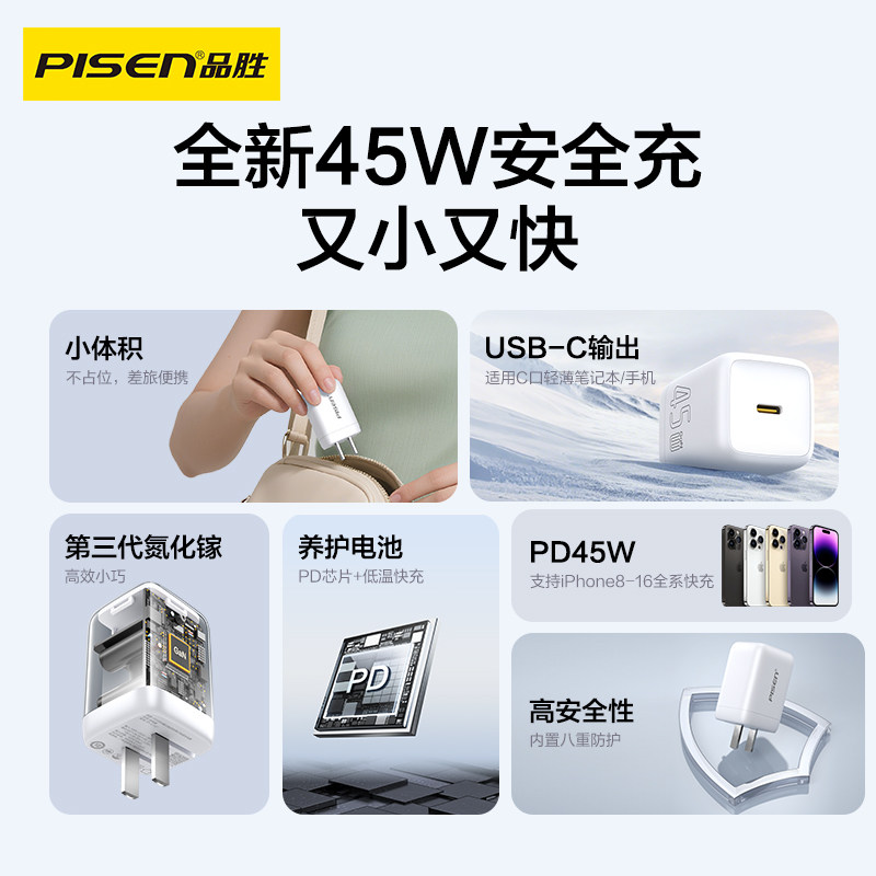 【iPhone17首选】品胜新款45W适用苹果17ProMax充电器线16充电头15氮化镓数据线40W手机插头Air快充typec一套