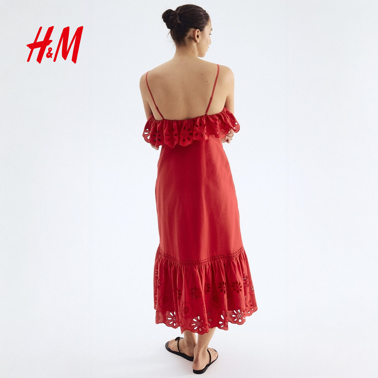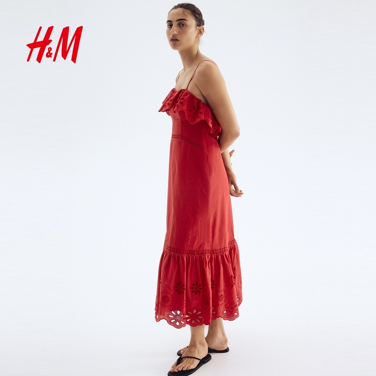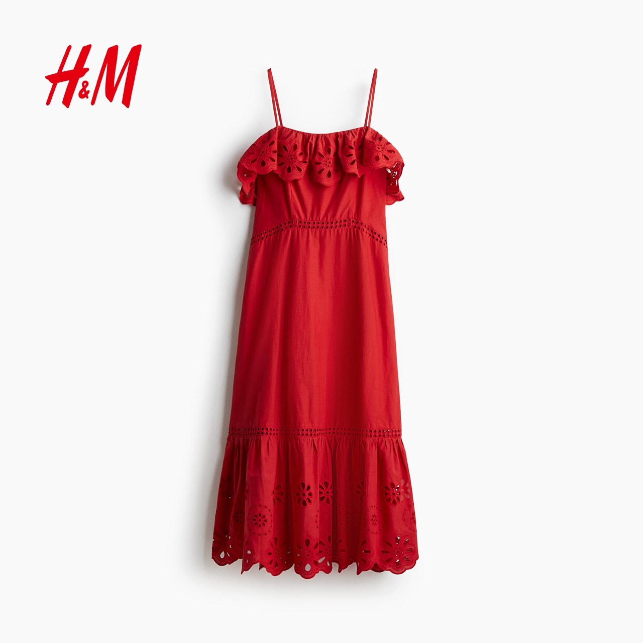 HM女装连衣裙2025冬季新款镂空刺绣棉质印花吊带连身裙1282051