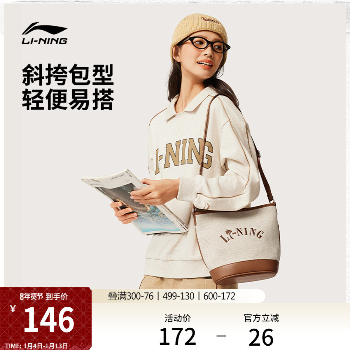 李宁斜挎包官方男女情侣水桶包经典休闲百搭单肩包便捷出行挎包