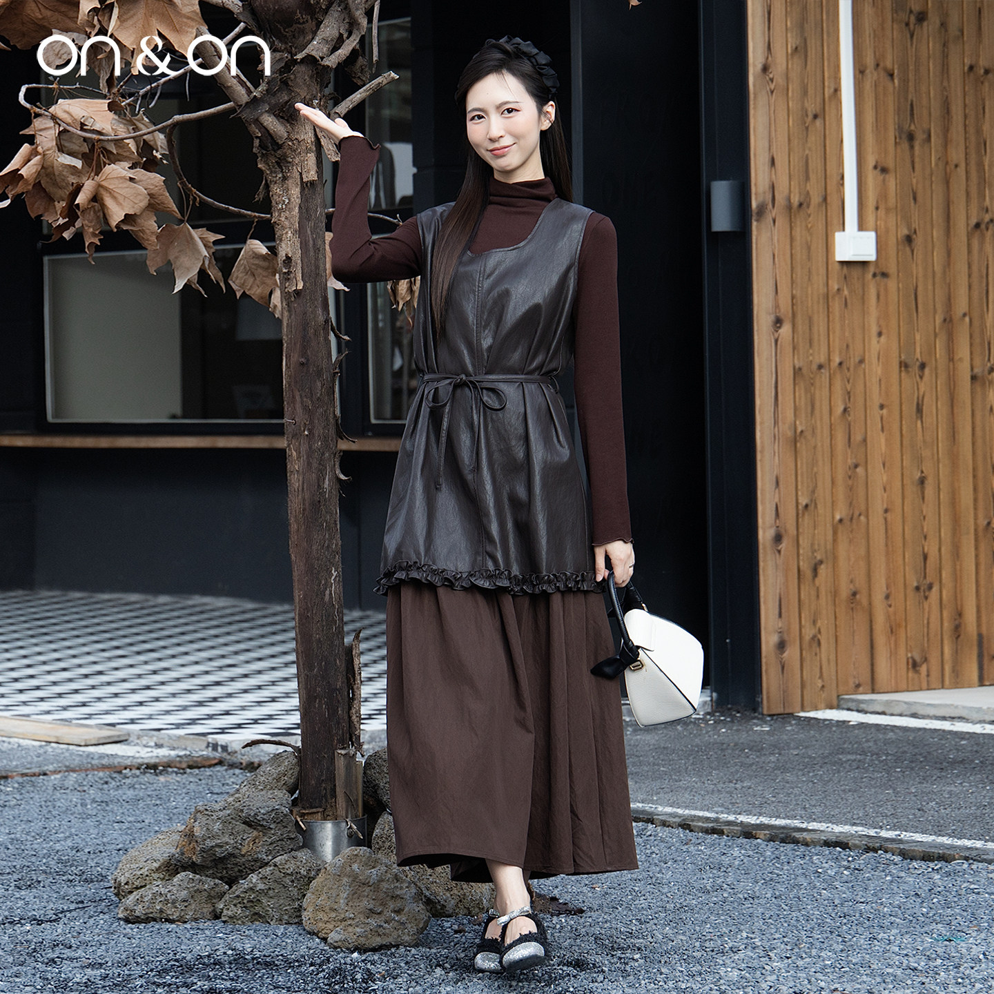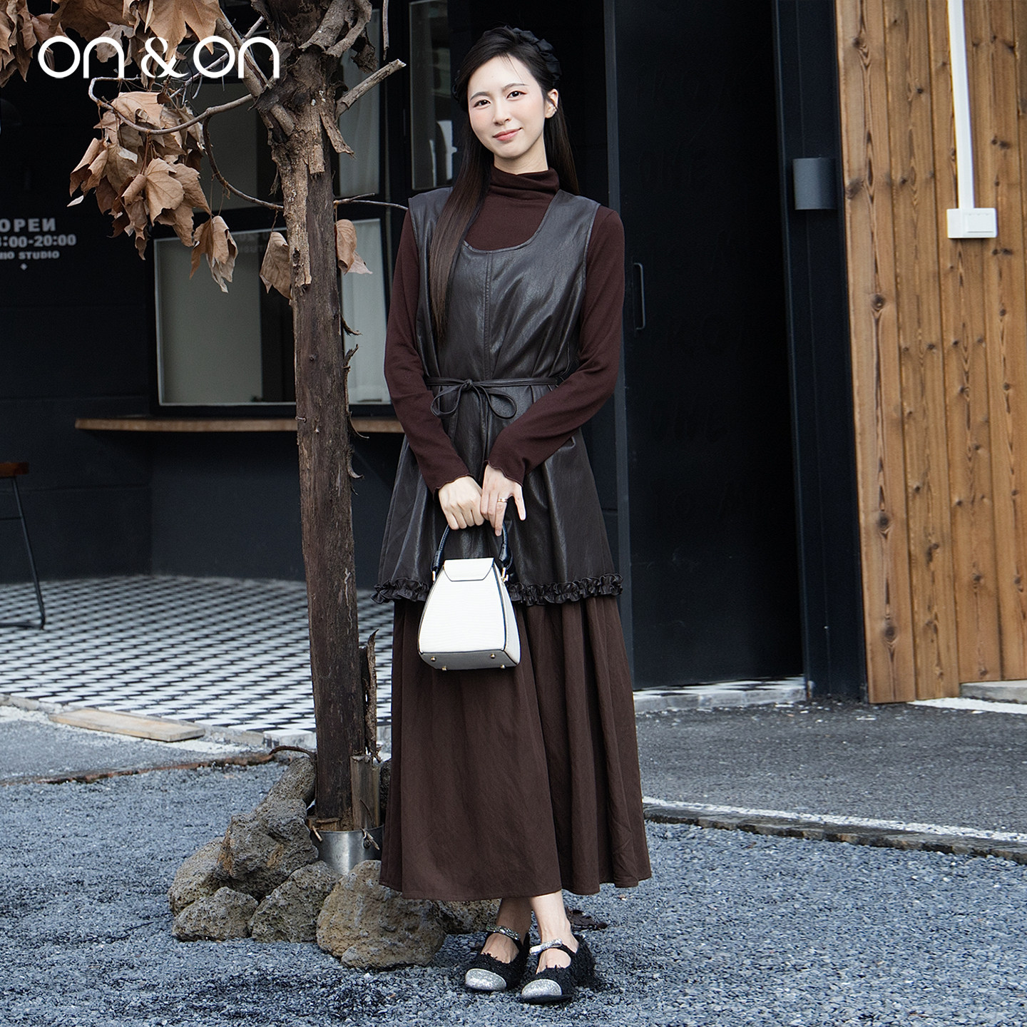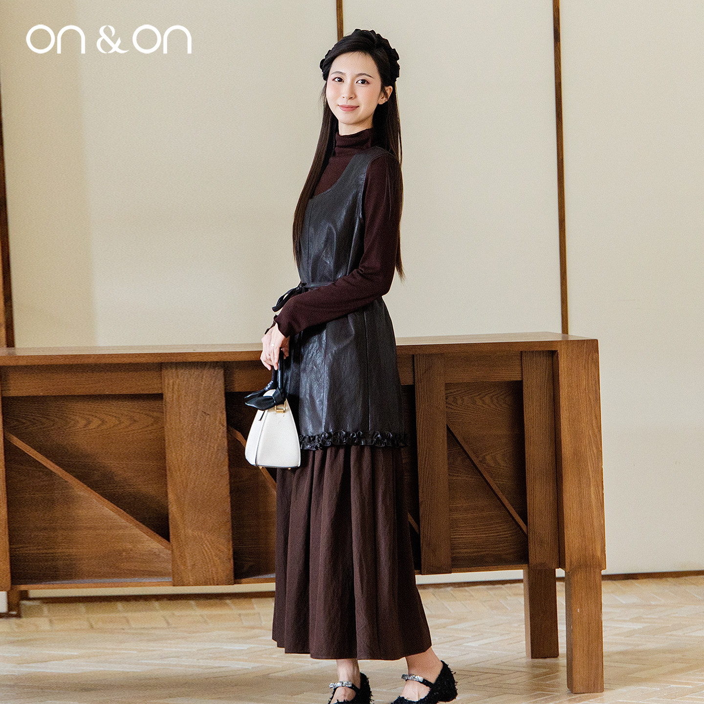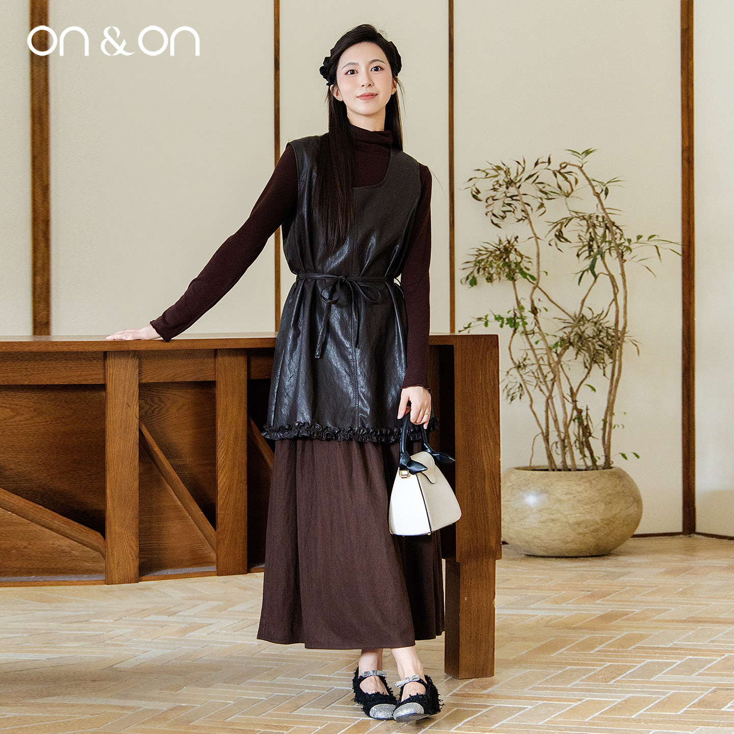ON&ON/安乃安2025冬季新款法式复古针织打底衫+收腰系带皮裙套装