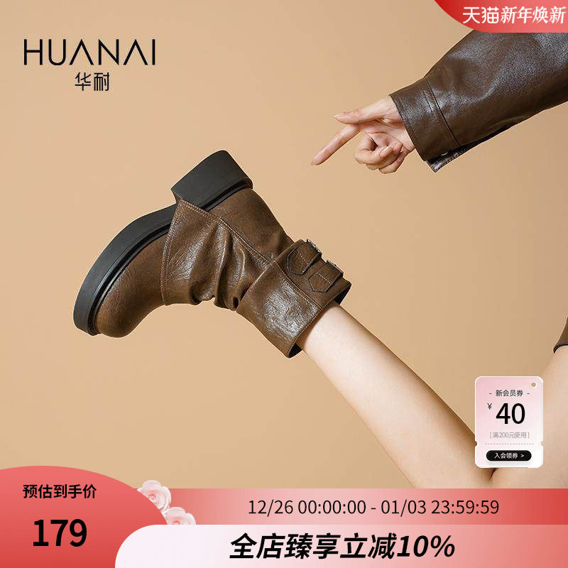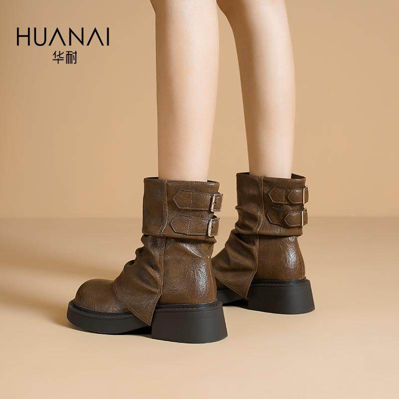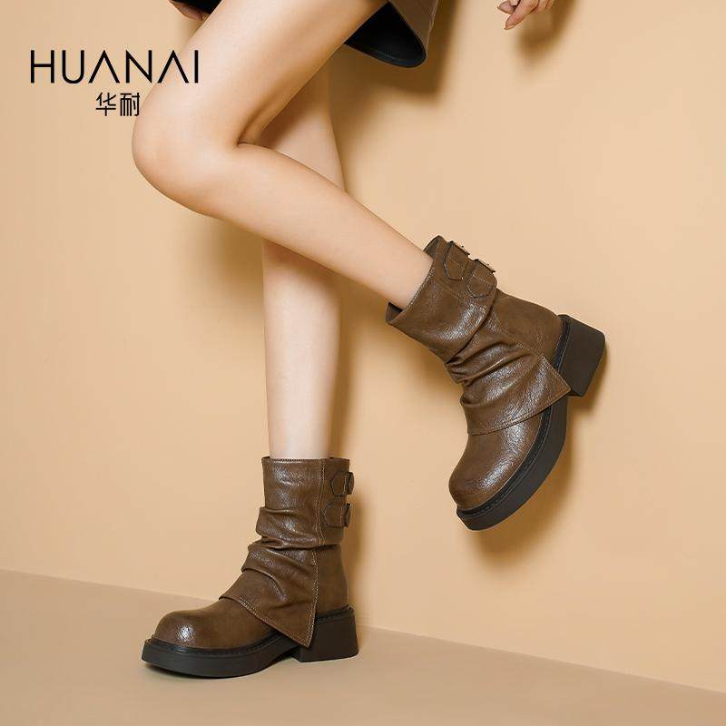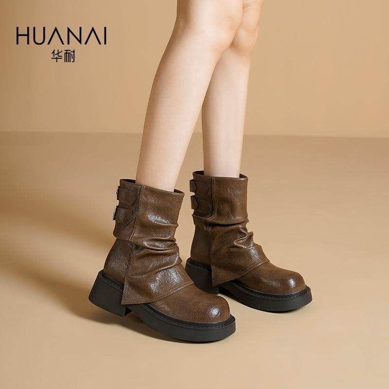 华耐中筒短靴女2025款秋冬堆堆靴裤管靴加绒加厚日常百搭马丁靴子