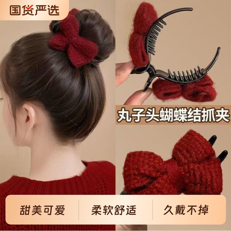 丸子头抓夹女新年2025新款红色后脑勺发夹针织马尾盘发神器头饰冬