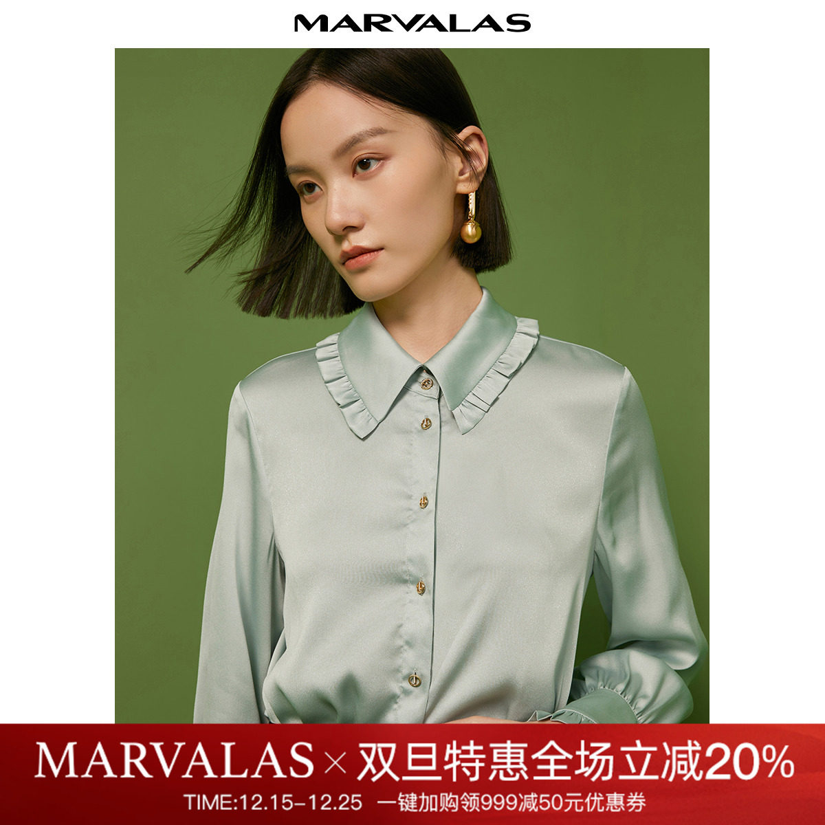 曼德诗雪纺衬衫女2025秋装新款缎感顺滑衬衣法式系带翻领简约上衣