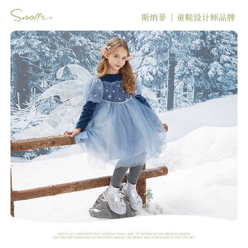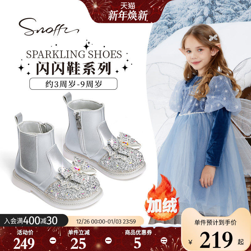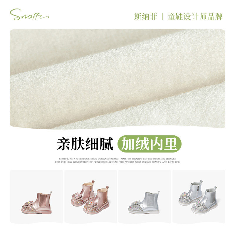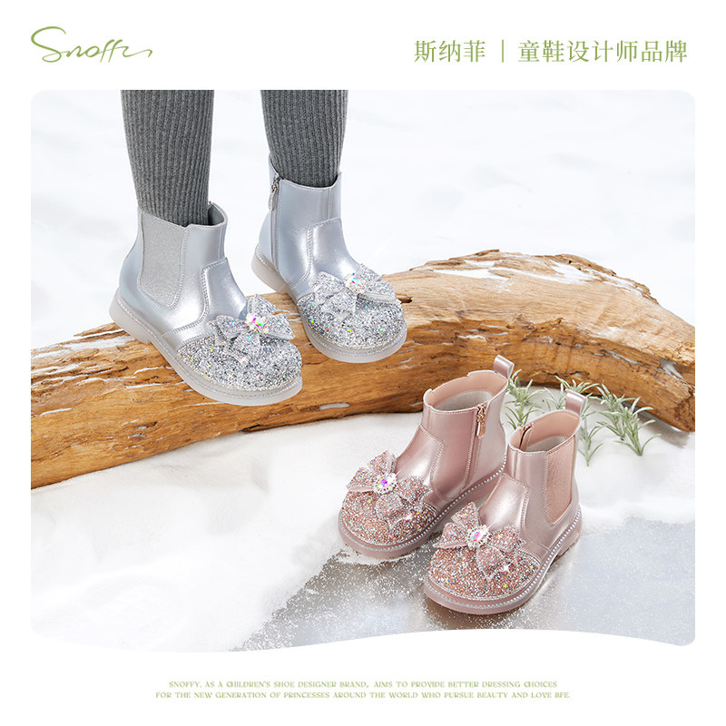 斯纳菲儿童短靴女童靴子小公主水晶靴2025秋冬新款中大童加绒皮靴