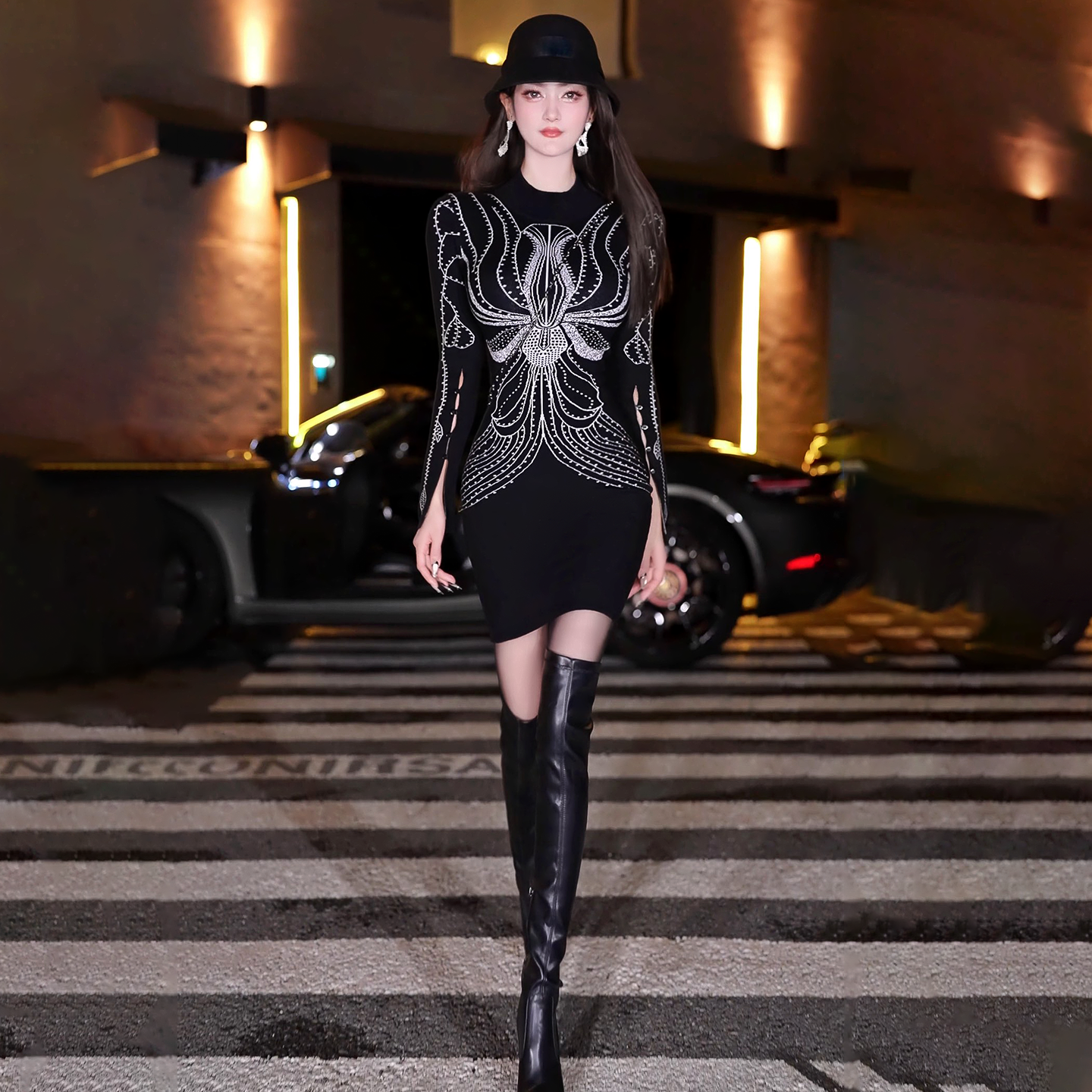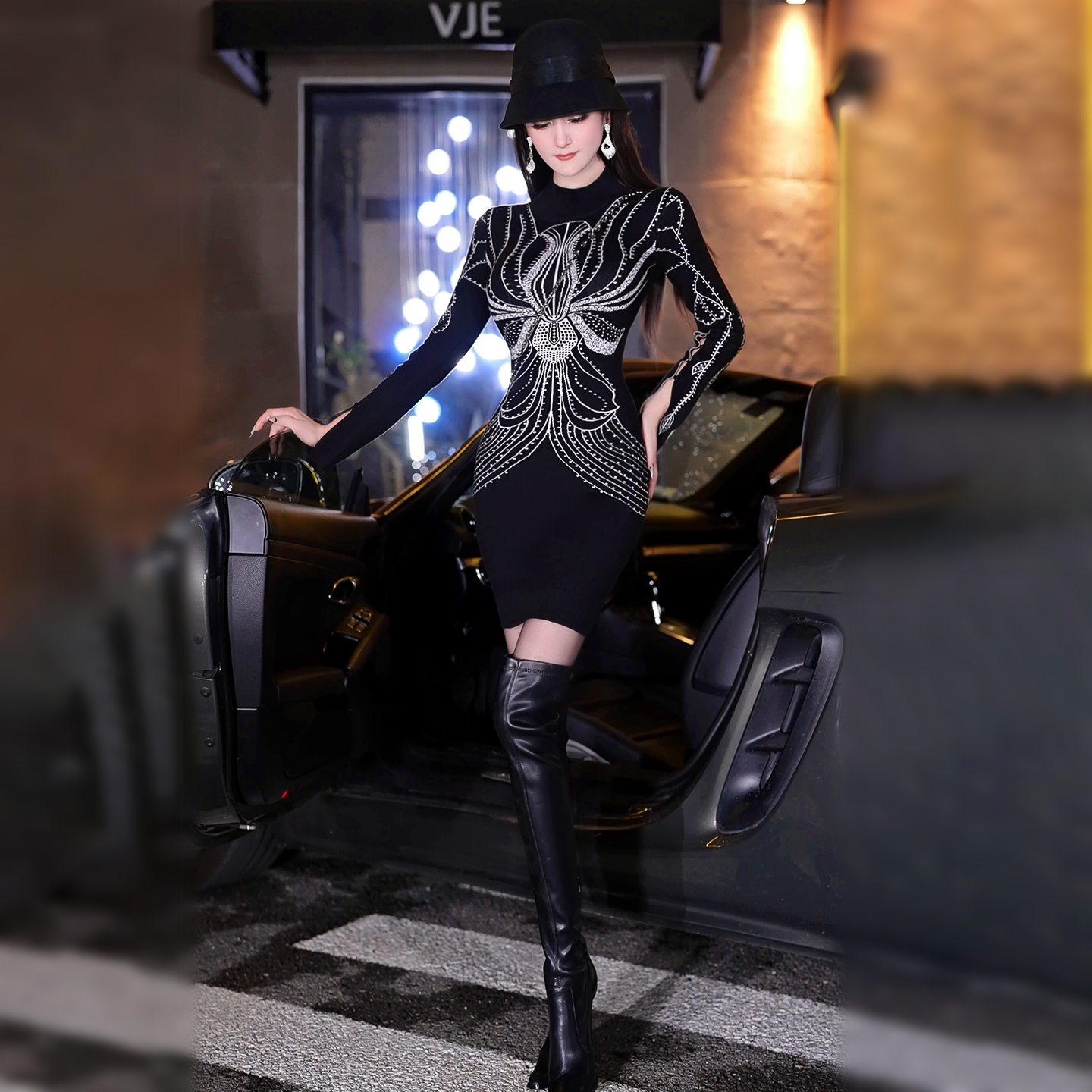 秋冬季欧美提花设计师款时尚针织裙2025新款高领修身打底连衣裙