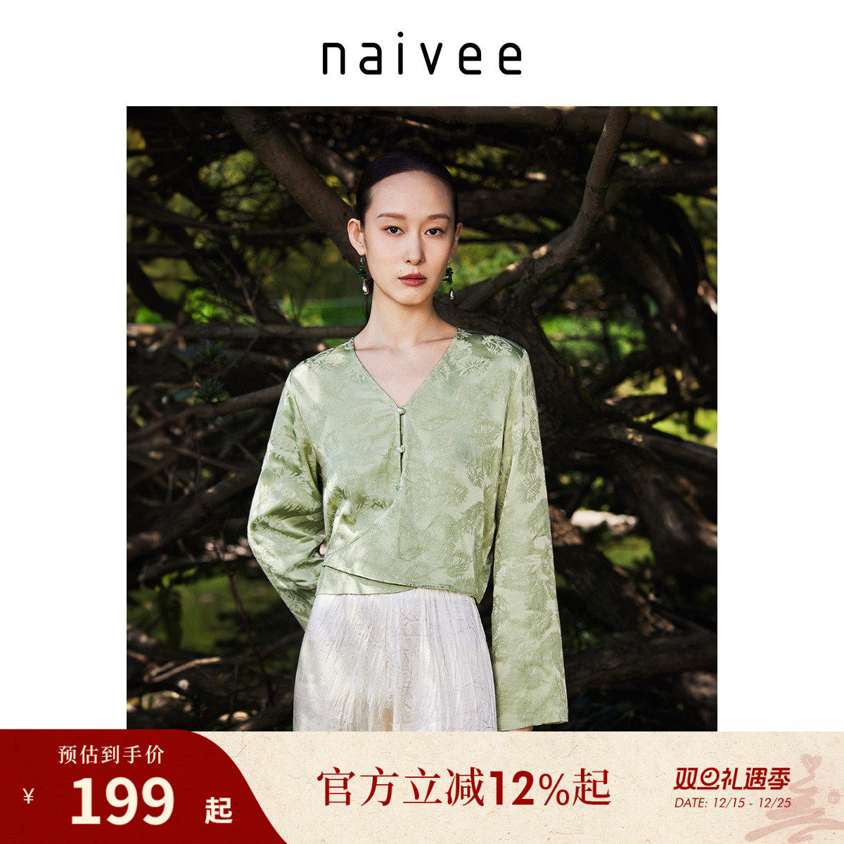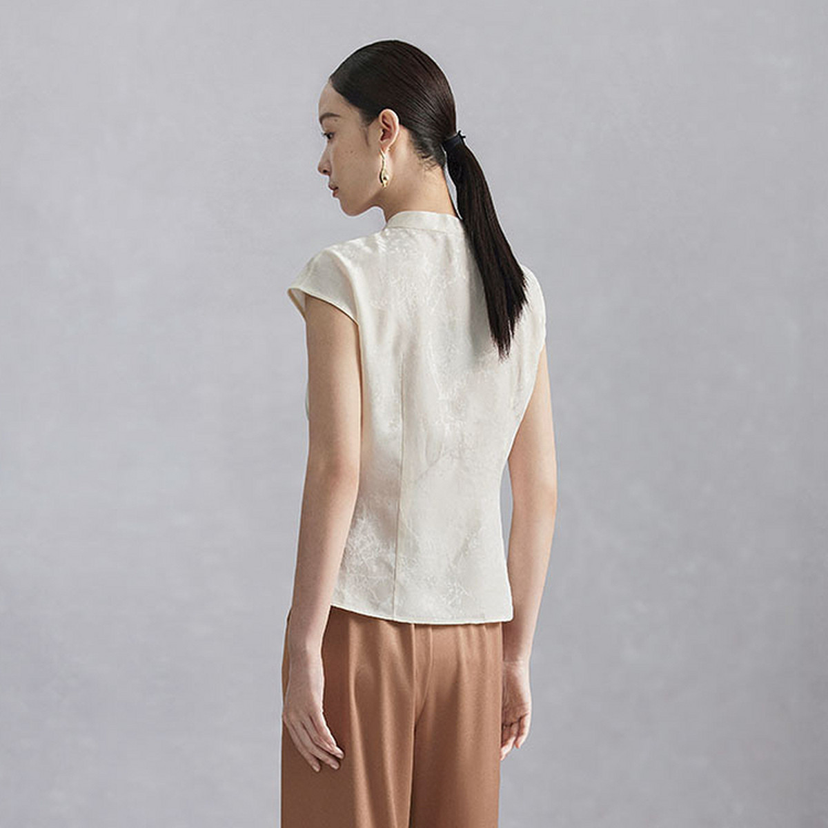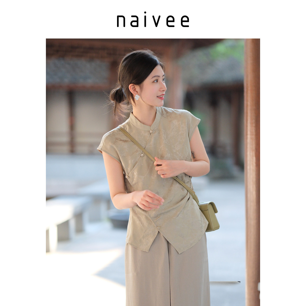 naivee纳薇夏款收腰显瘦新中式女装无袖立领短袖衬衫醋酸上衣