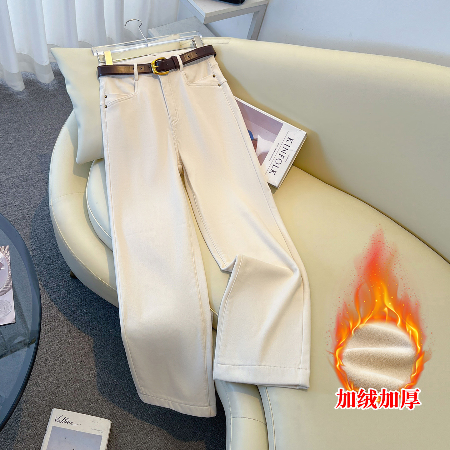 米白色直筒加绒牛仔裤女2026新款加厚小个子休闲显瘦百搭阔腿裤子