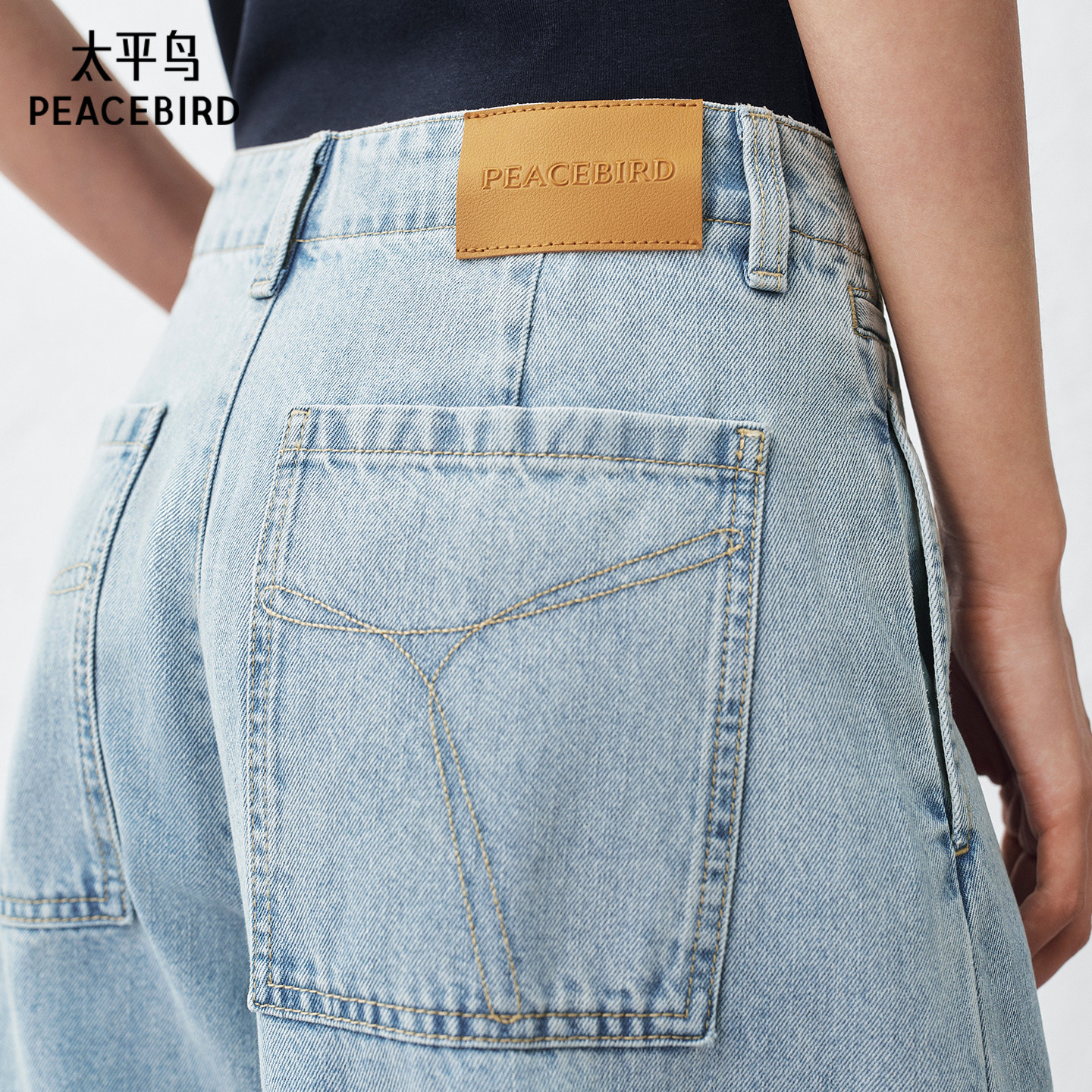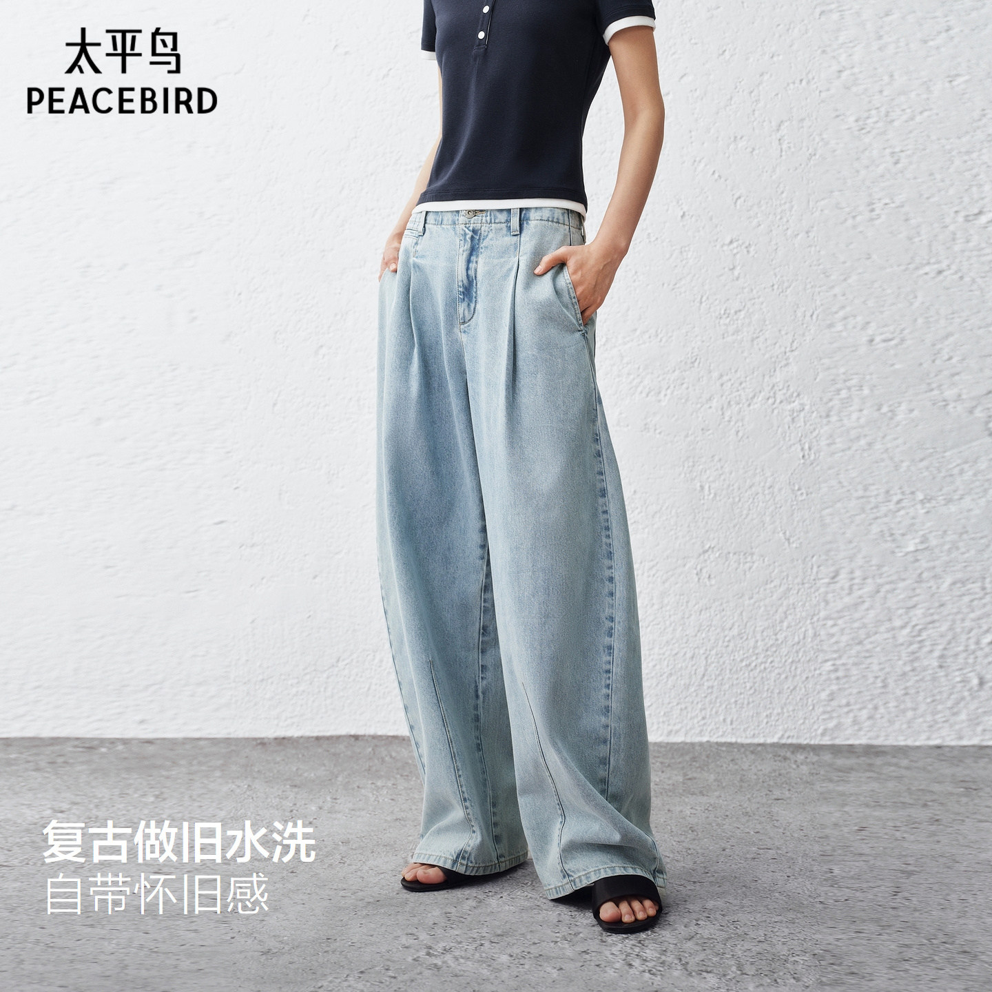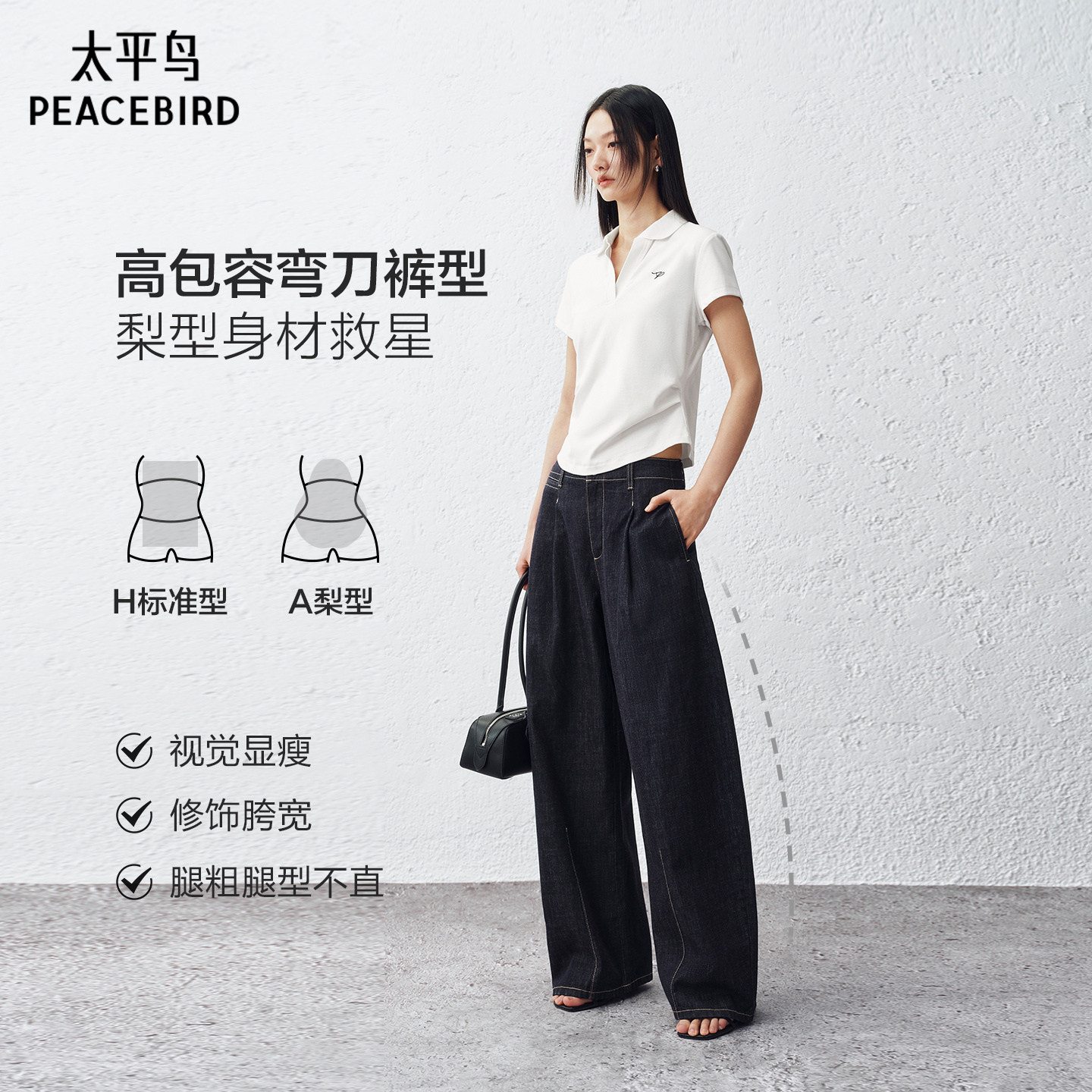 太平鸟高腰阔腿弯刀牛仔裤26夏新款梨型显瘦不褪色原牛杨桃牛仔裤