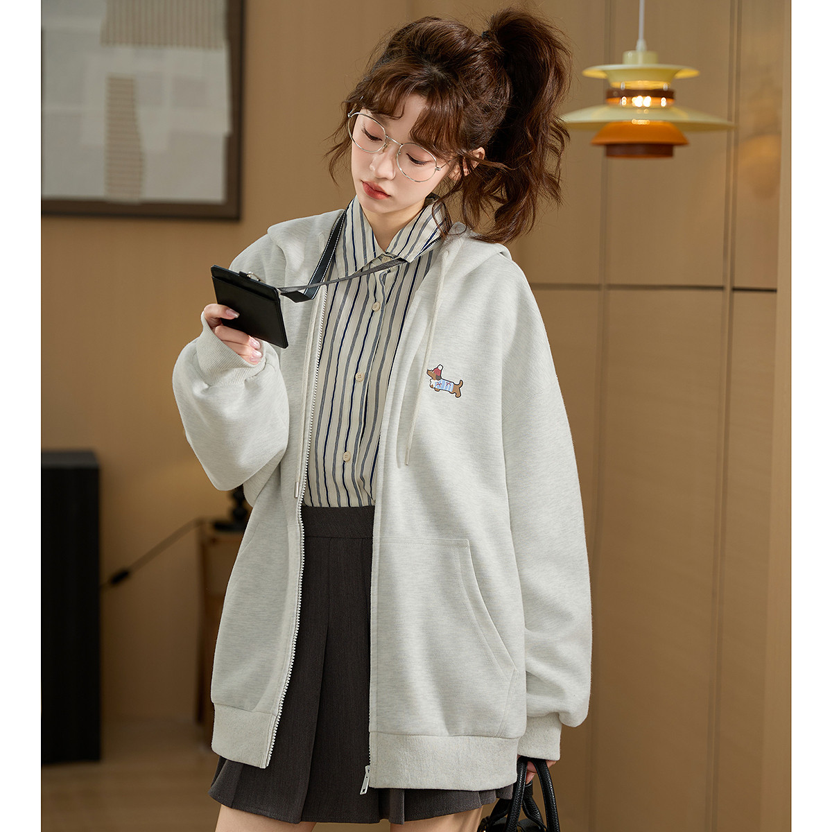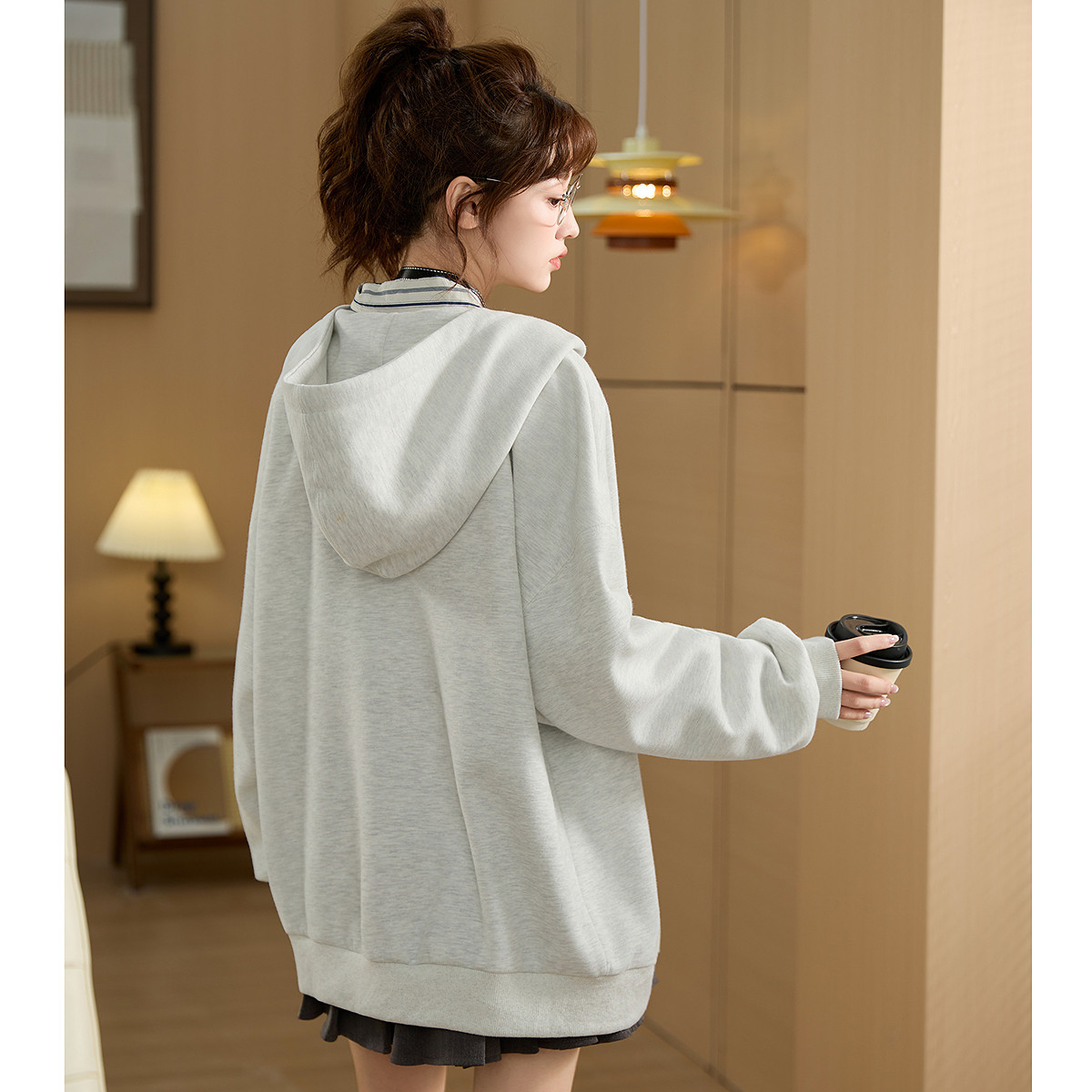 唐狮秋季新款外套女韩版花灰色宽松慵懒风连帽拉链开衫卫衣tu