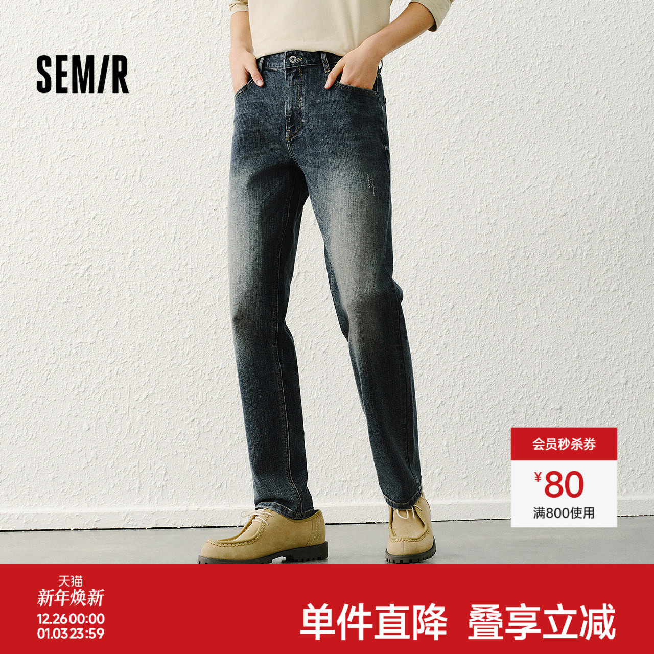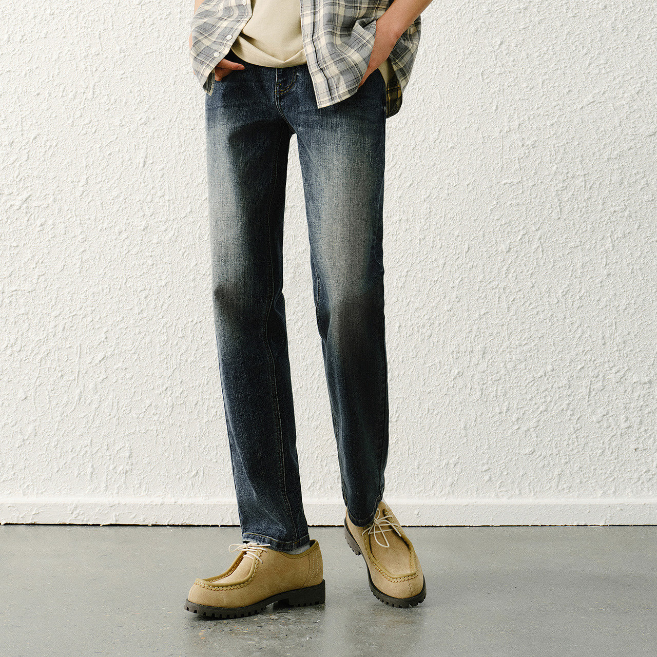 森马牛仔裤男士春装竹节肌理合体直筒裤子轻复古打磨做旧水洗长裤