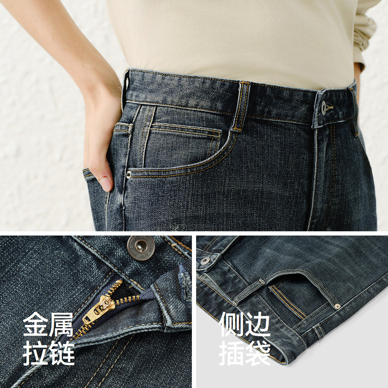 合体直筒牛仔裤 竹节肌理 复古做旧