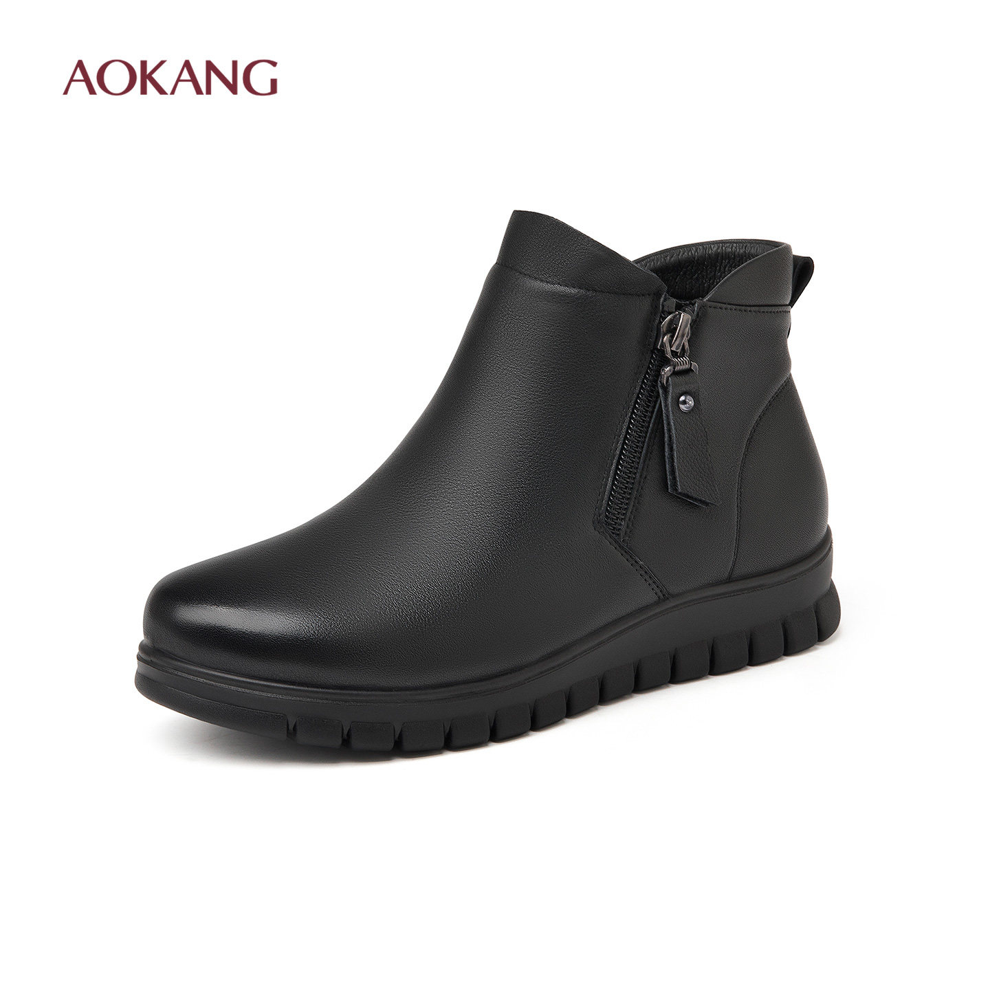奥康 女鞋妈妈棉鞋中老年平底女靴真皮软底靴子加绒加厚保暖短靴N