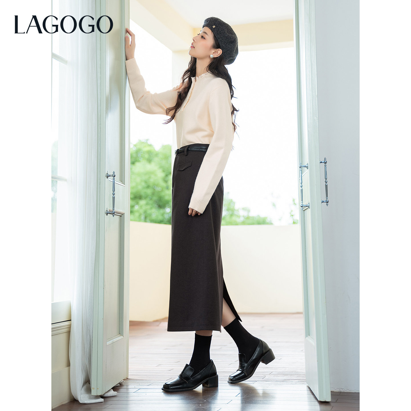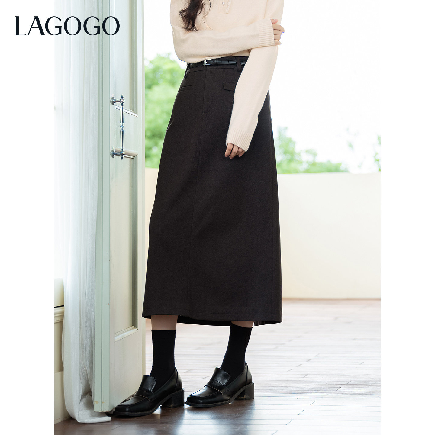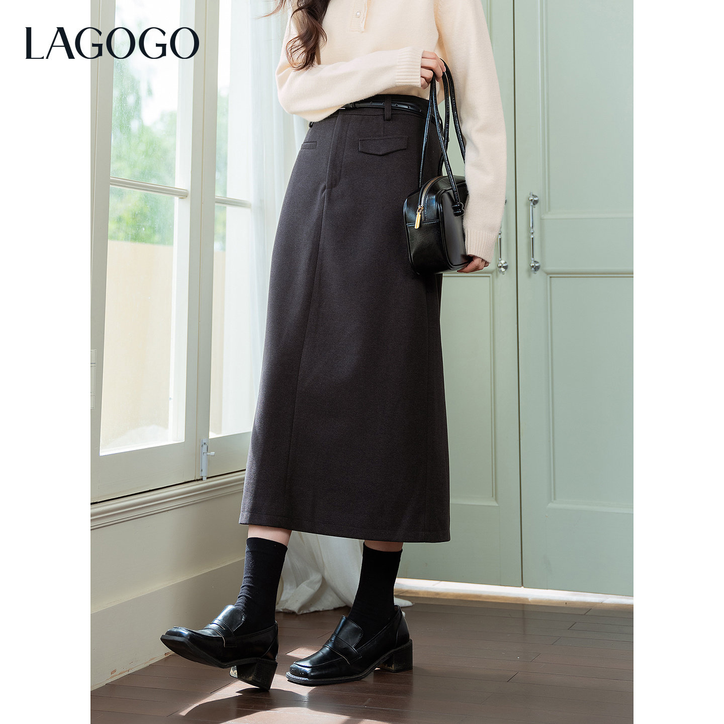 LAGOGO挪威雾灰半身裙女拉谷谷2025冬新款仿毛呢通勤简约中长裙子