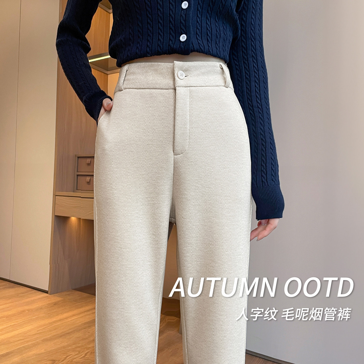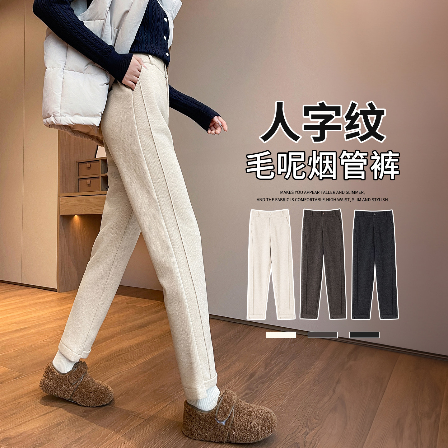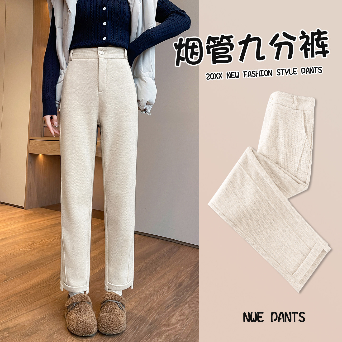 白色小脚裤女2025新款冬加厚小个子九分休闲毛呢西装加绒烟管裤子