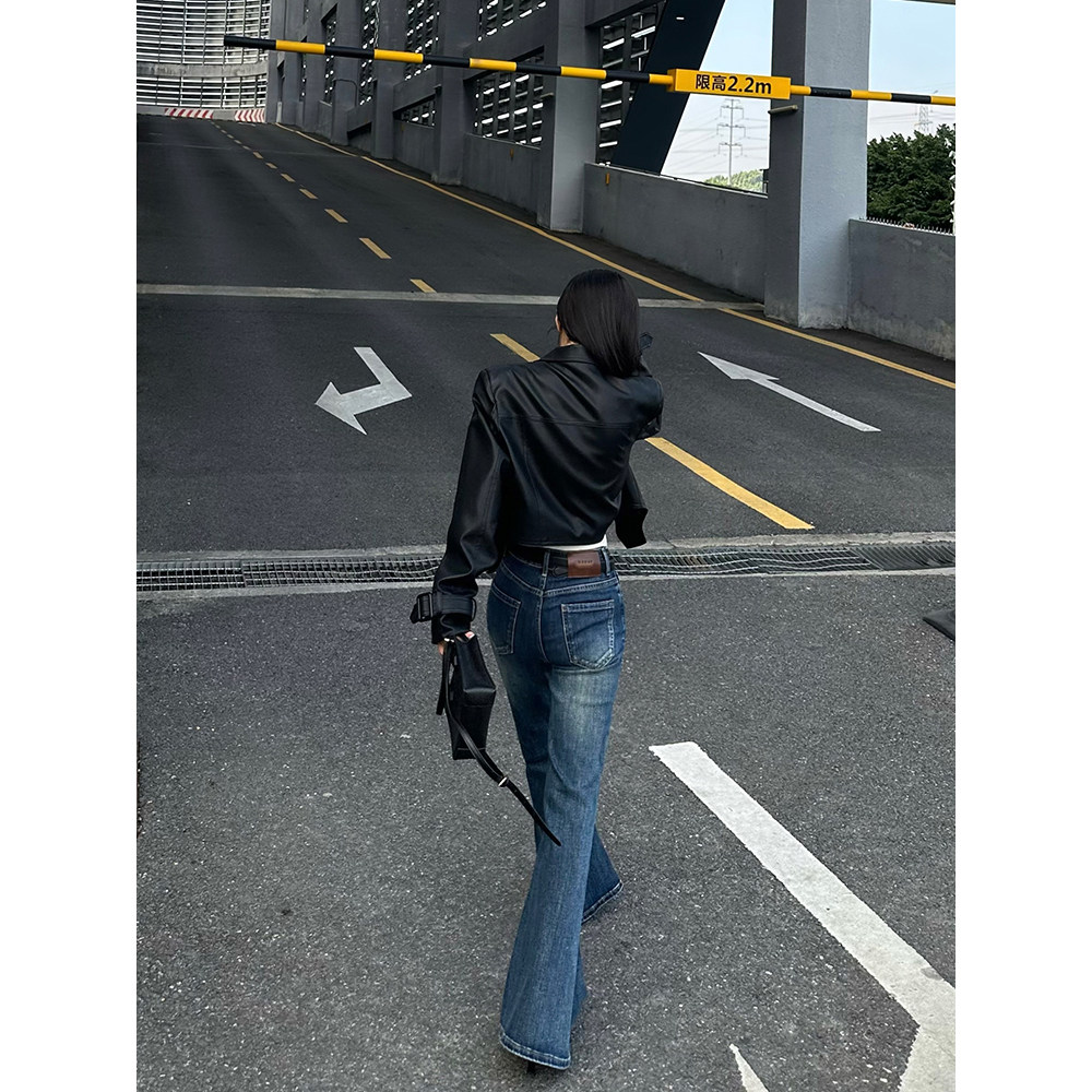 王家有鱼秋季新款2025复古蓝微喇牛仔裤中高腰不贴腿显瘦裤子女款