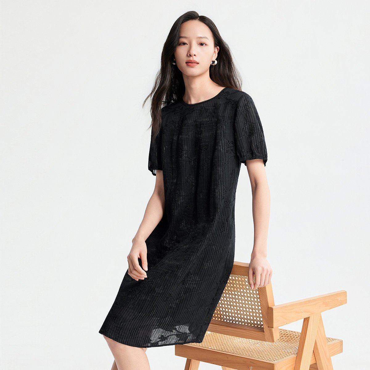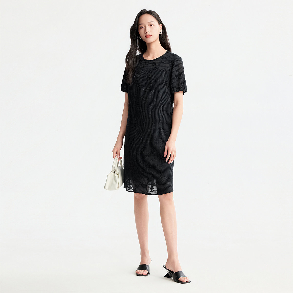 【热销补货】欧时力 褶皱短袖连衣裙女2026春新款收腰显瘦小黑裙
