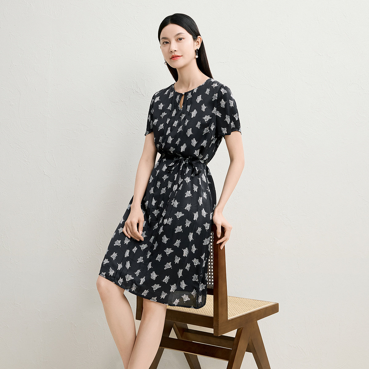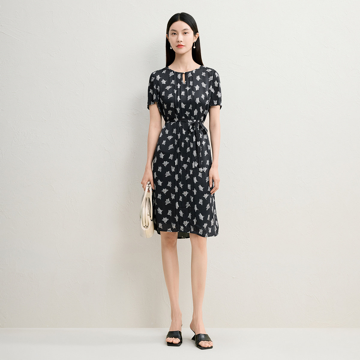 FINITY菲妮迪连衣裙2026年夏季新款简约黑白印花气质系带裙子女装