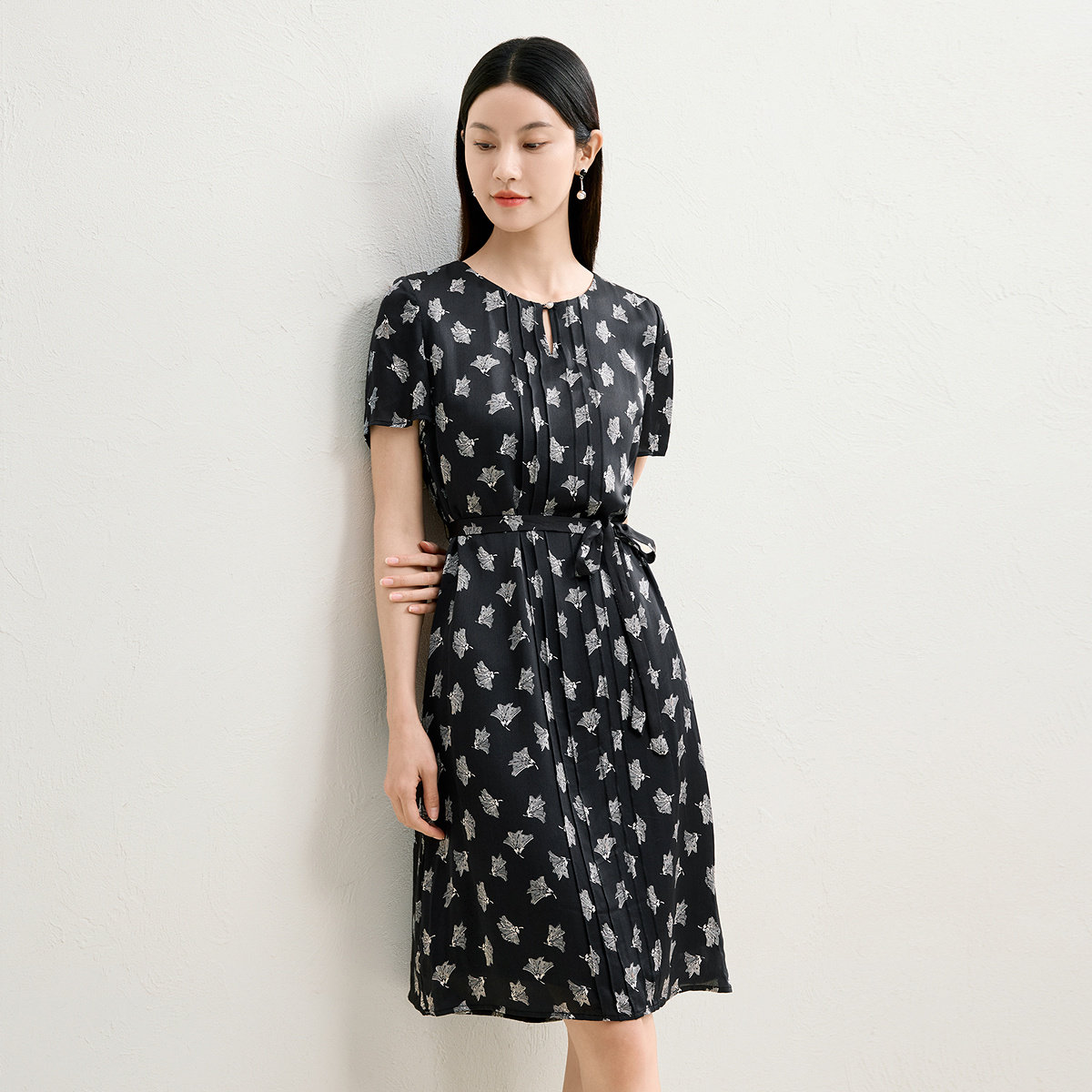 【热销补货】欧时力 褶皱短袖连衣裙女2026春新款收腰显瘦小黑裙