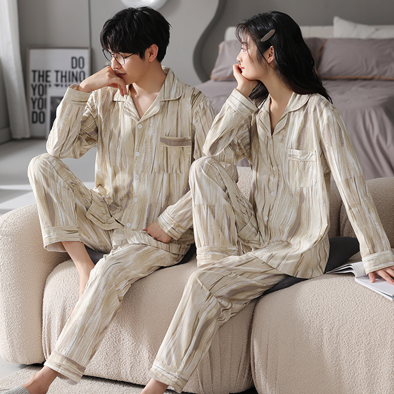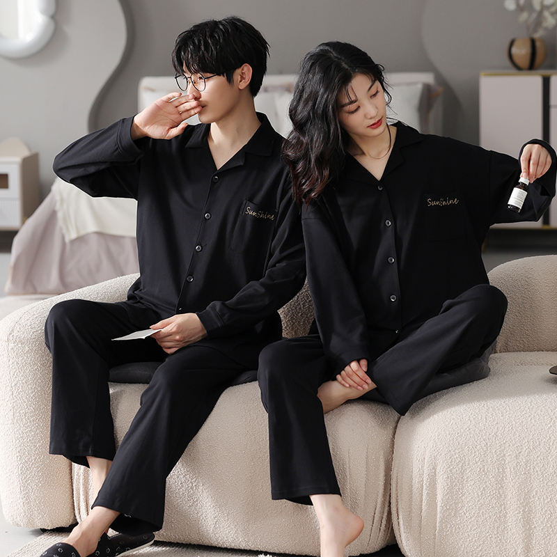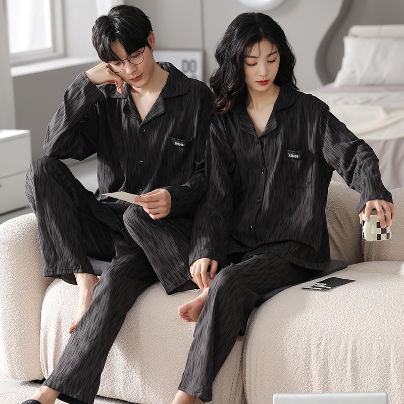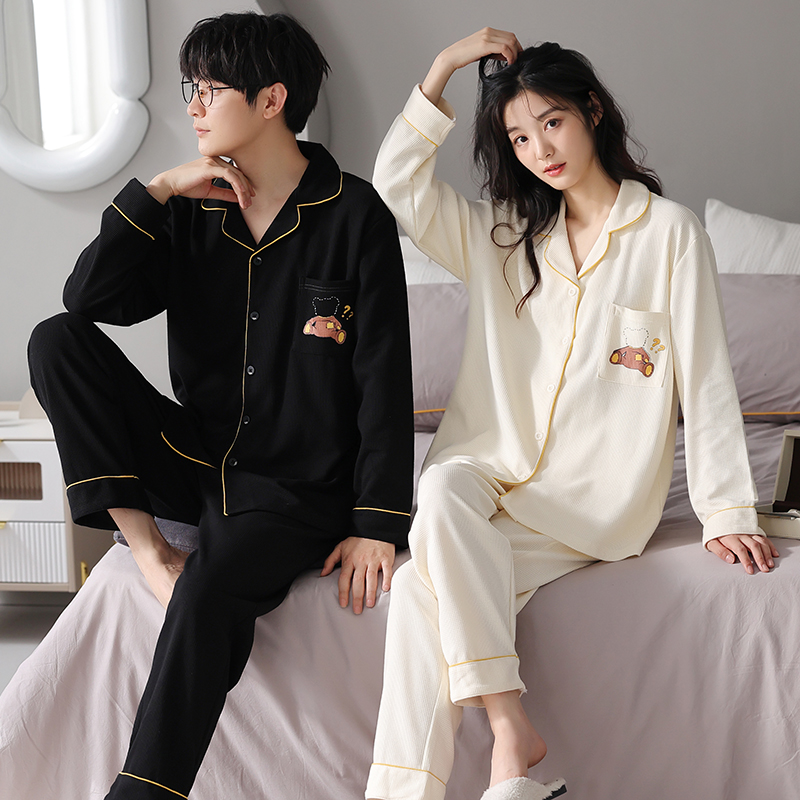 安比斯情侣睡衣舒适纯棉秋季女长袖男女同款休闲家居服套装可出门