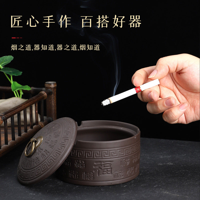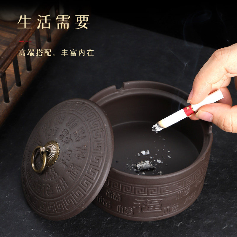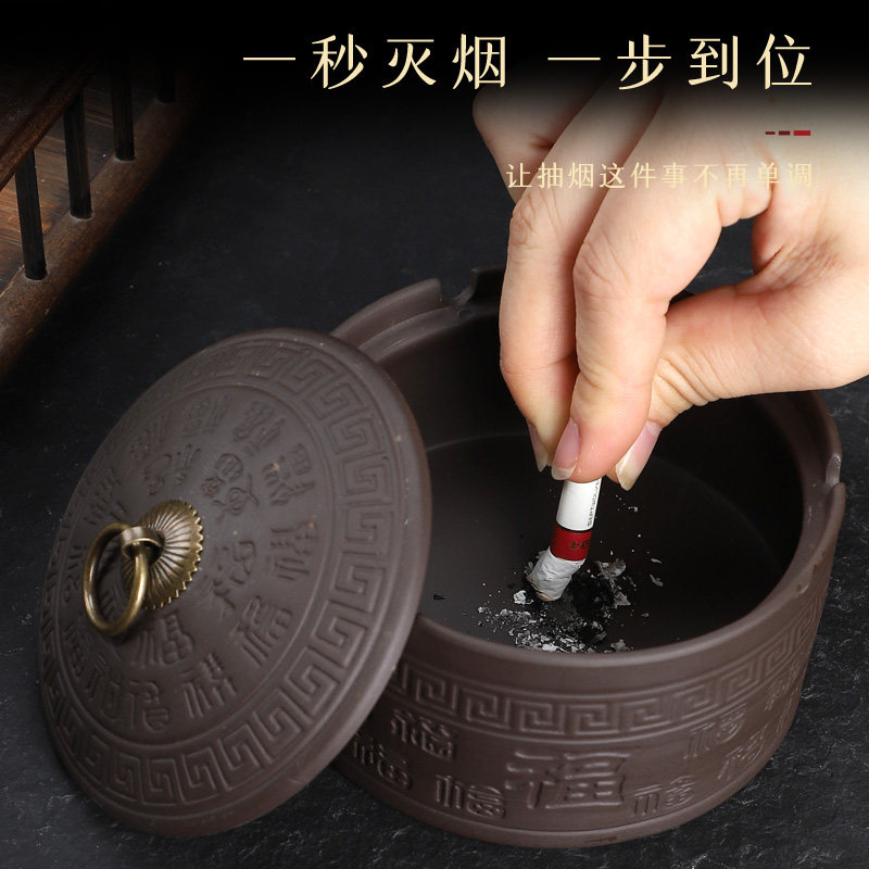 紫砂烟灰缸复古带盖百福卧室创意家用客厅陶瓷办公室灭烟摆件神器