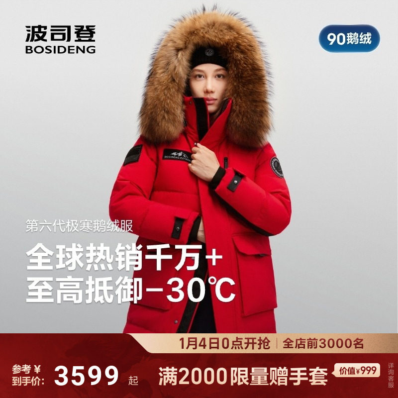 【新年红色】波司登极寒90鹅绒25新款羽绒服女大毛领结婚过膝长款