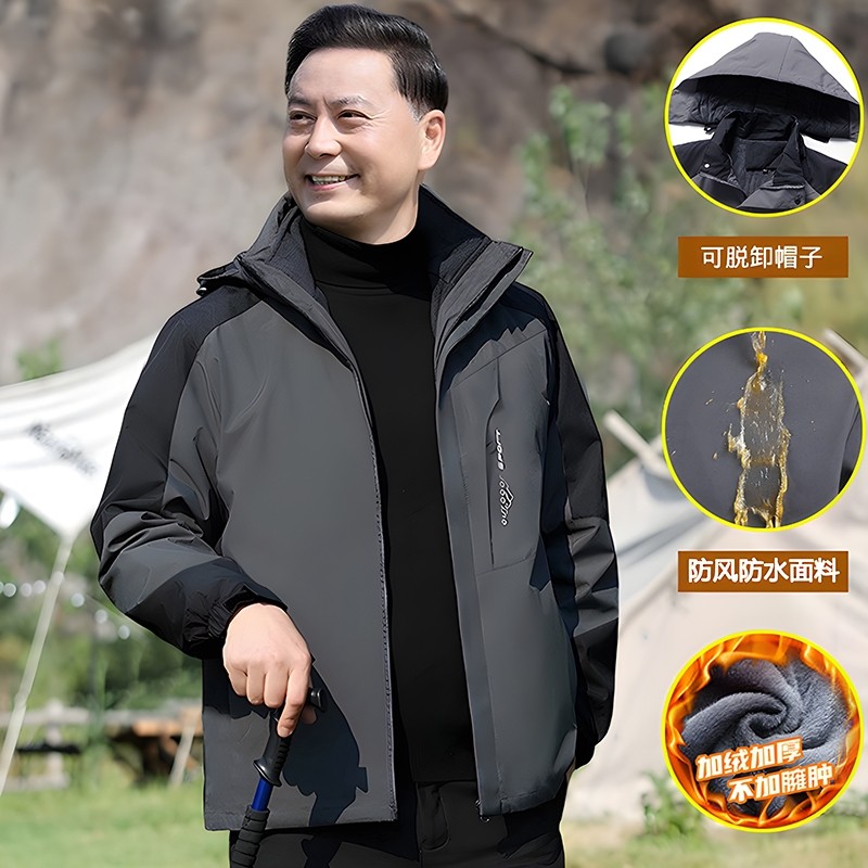 冲锋衣男款爸爸秋冬季加绒外套装中年男士三防合一夹克老年人上衣