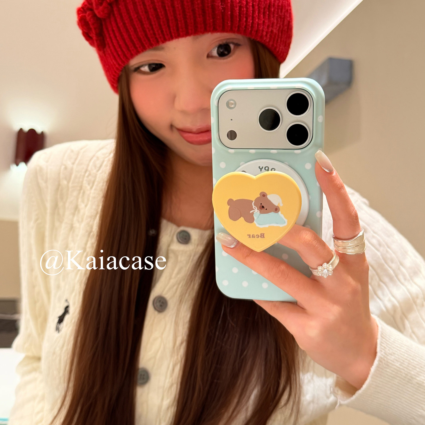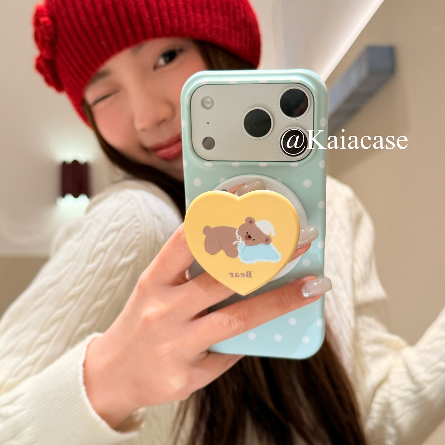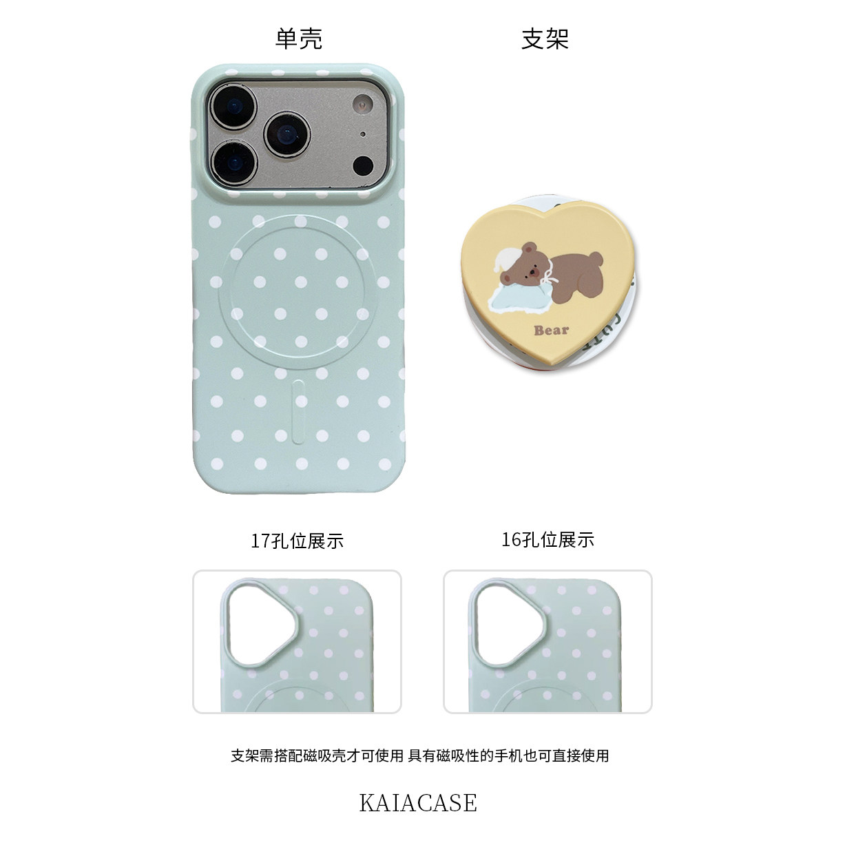 kaia 韩风ins薄荷绿波点小熊适用苹果17promax手机壳iphone16pro新款17女16pro创意支架15pro磨砂防摔手机套