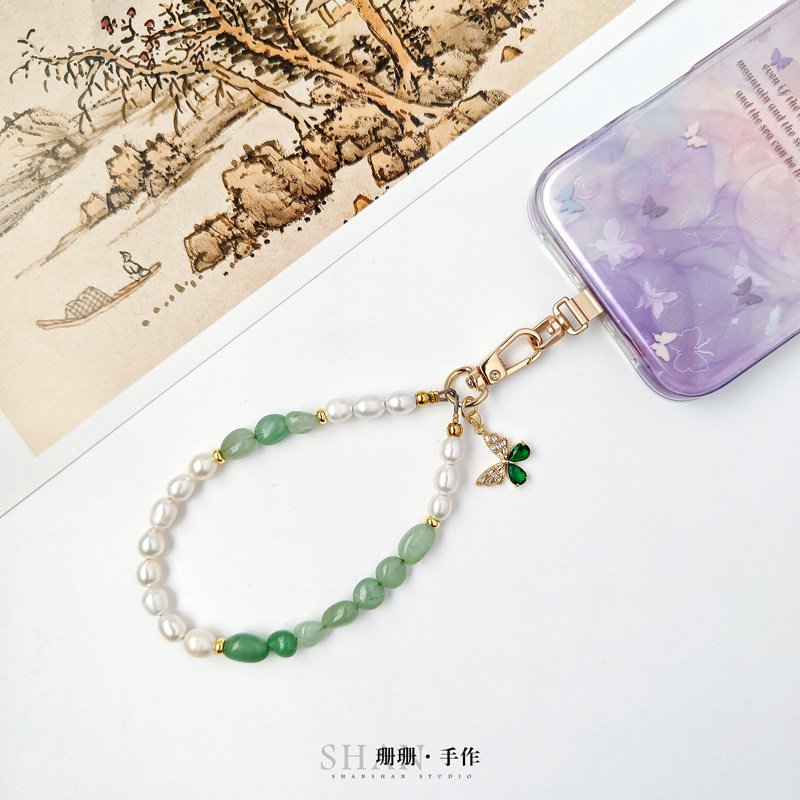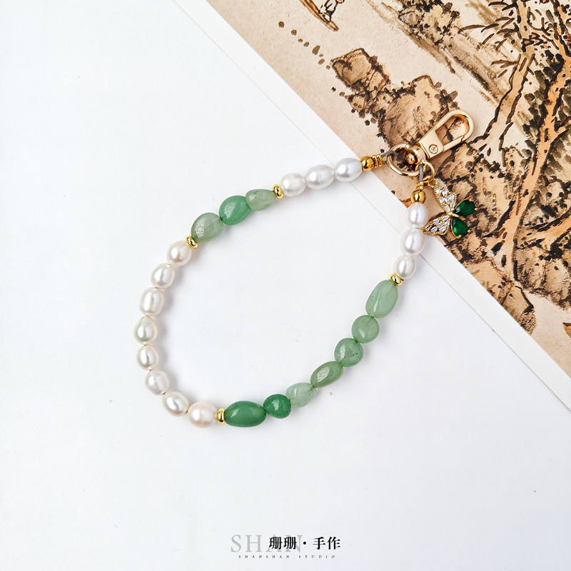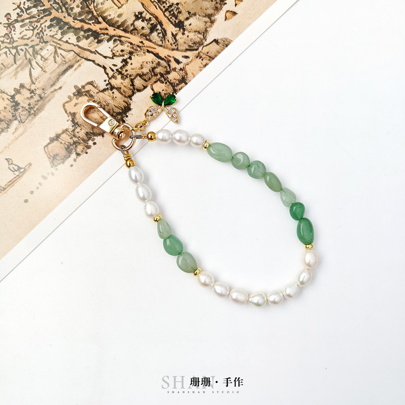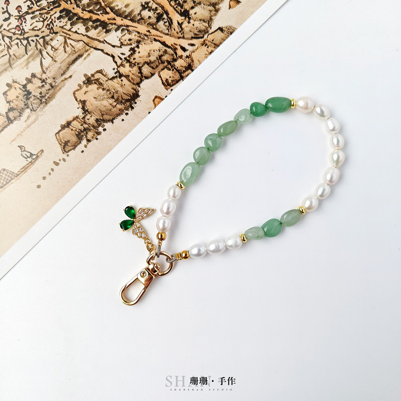 原创天然淡水珍珠手机链绿水晶手腕挂绳钥匙包包挂饰可提清爽礼物