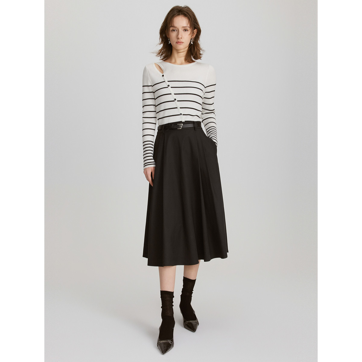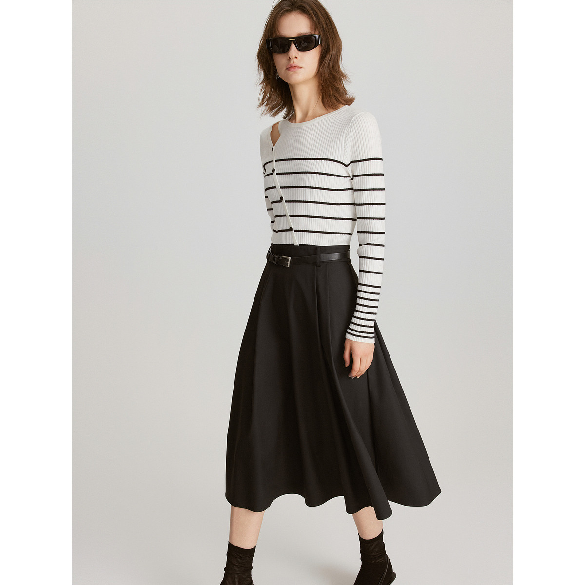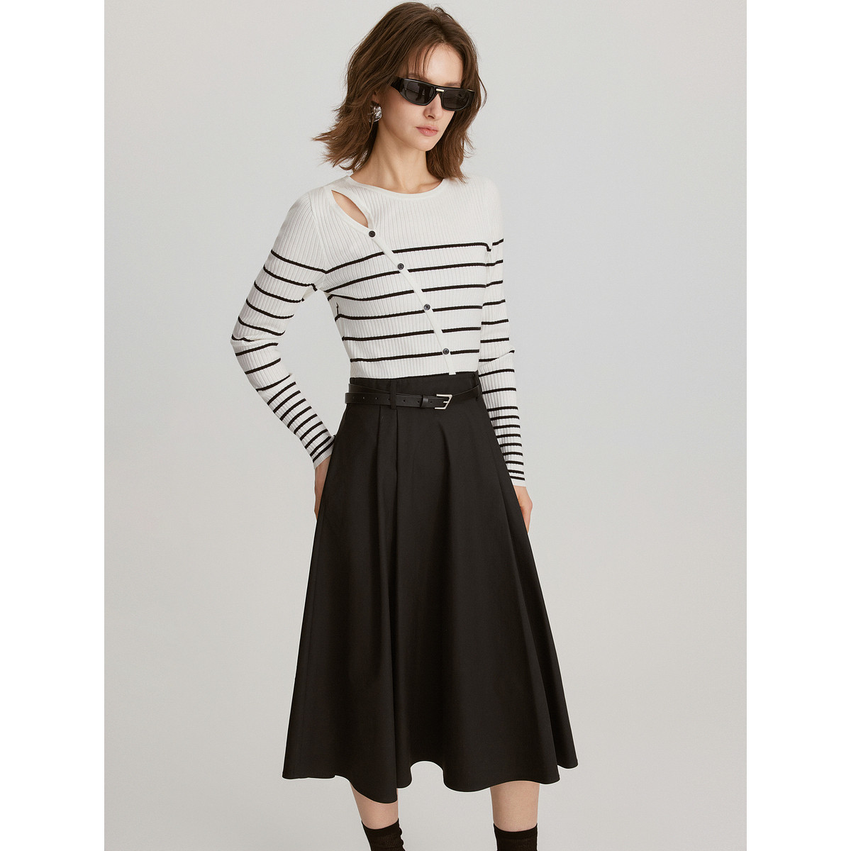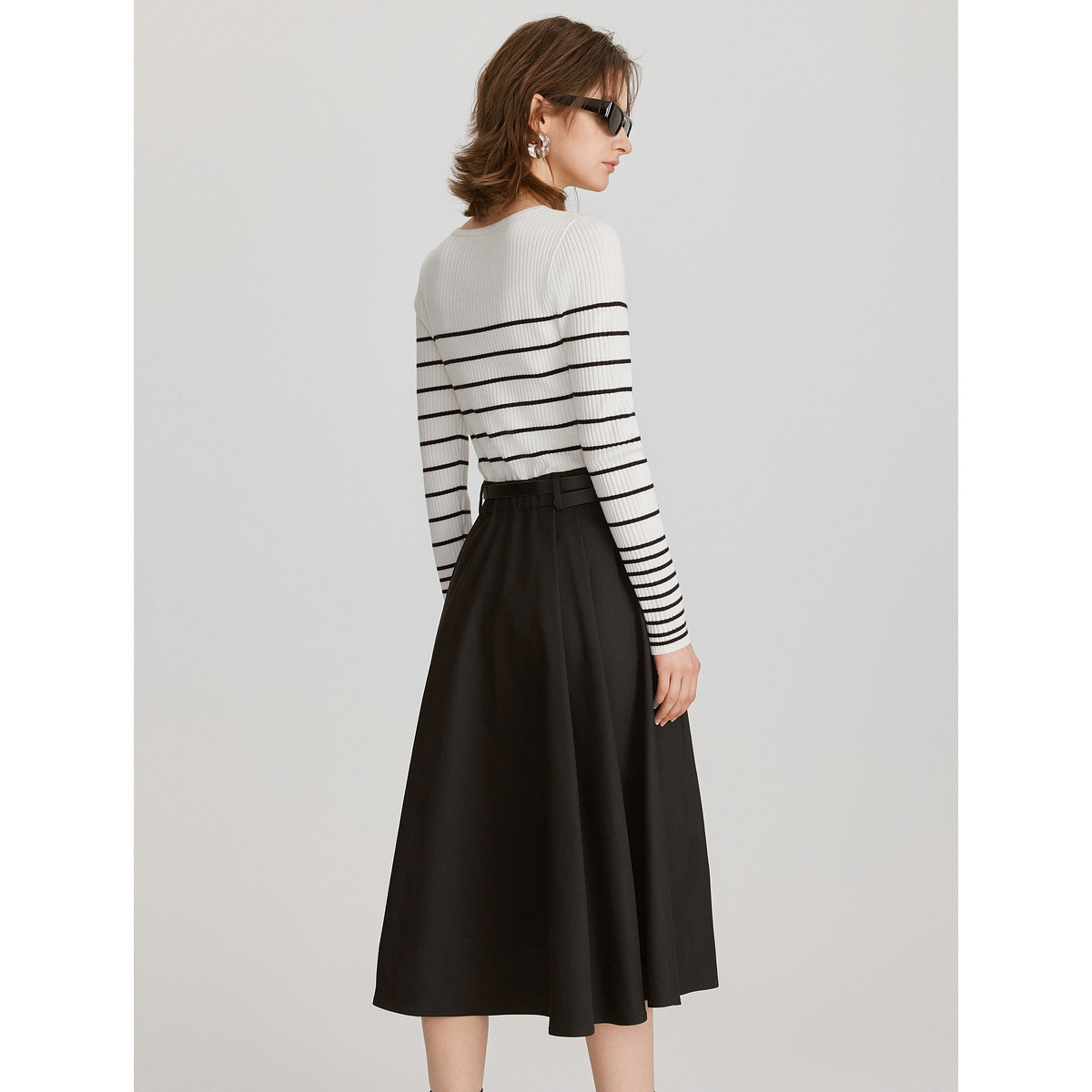 ELLE假两件拼接撞色镂空条纹连衣裙女2025秋装新款修身系带裙子