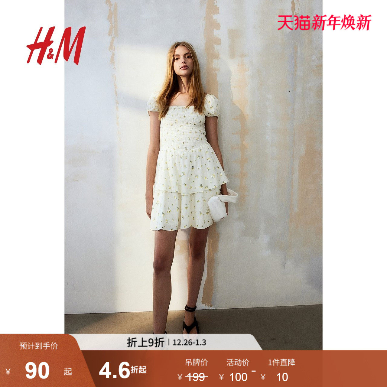 HM女装连衣裙秋季分层裙摆缩褶方领泡泡袖公主裙1219988