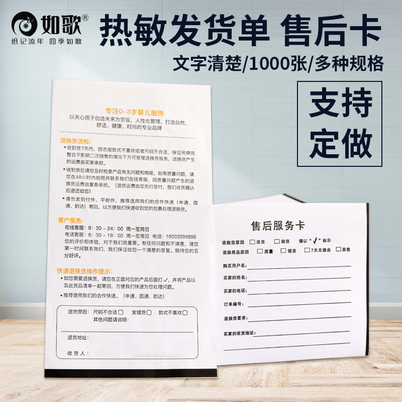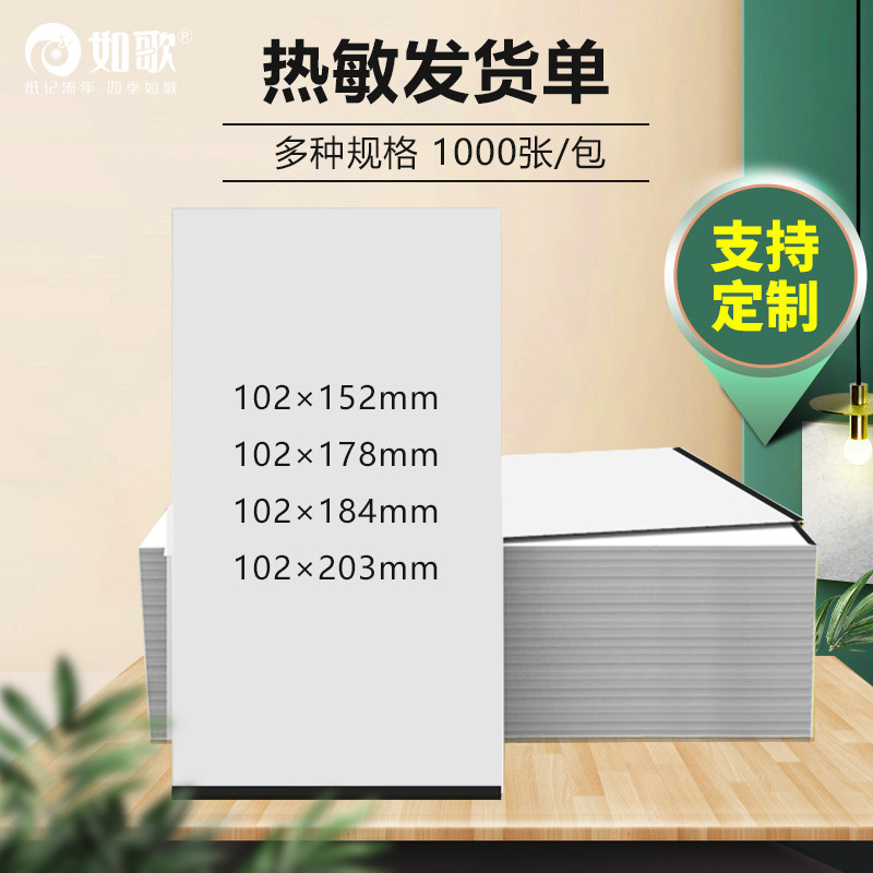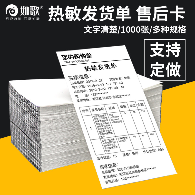 如歌热敏纸发货单淘宝清单打印纸电商销售购货出库售后服务热敏卡定制102mm*152mm/178mm/184/203mm*105mm