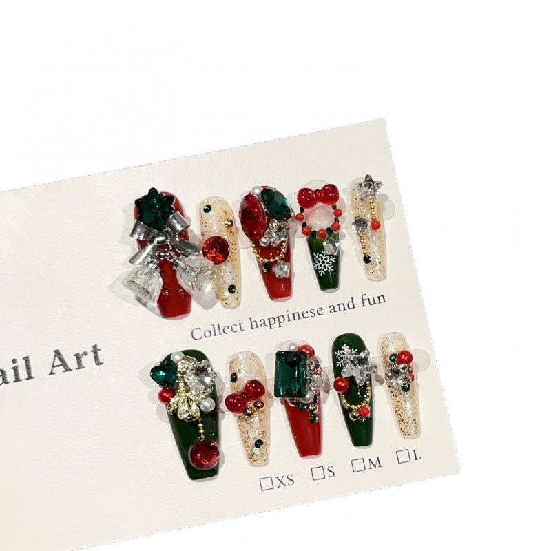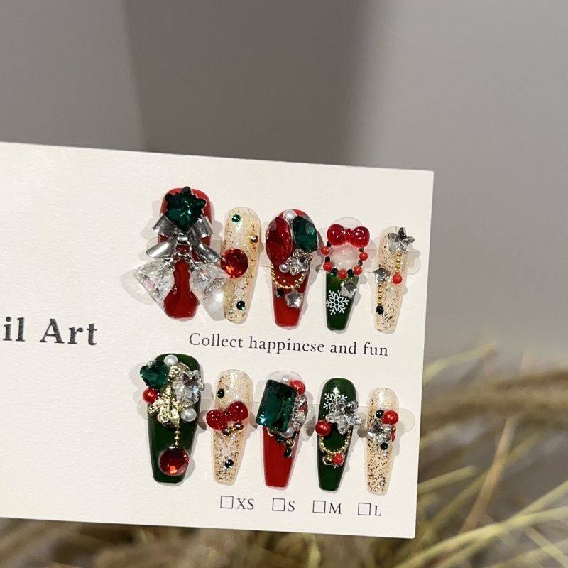 纯手工穿戴甲高级感圣诞节红绿色美甲片欧美风铃铛重工假指甲贴片