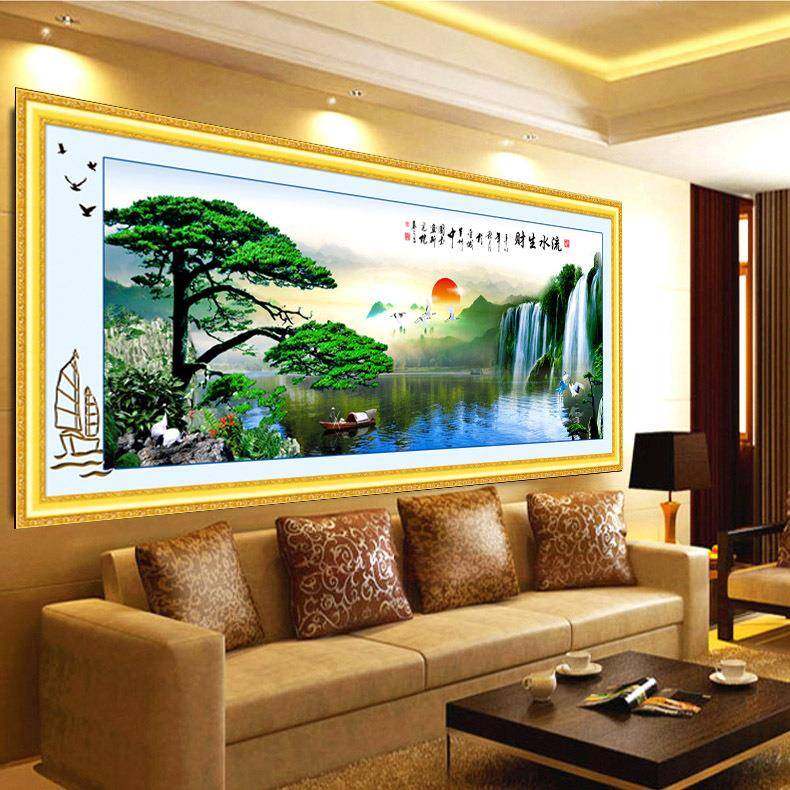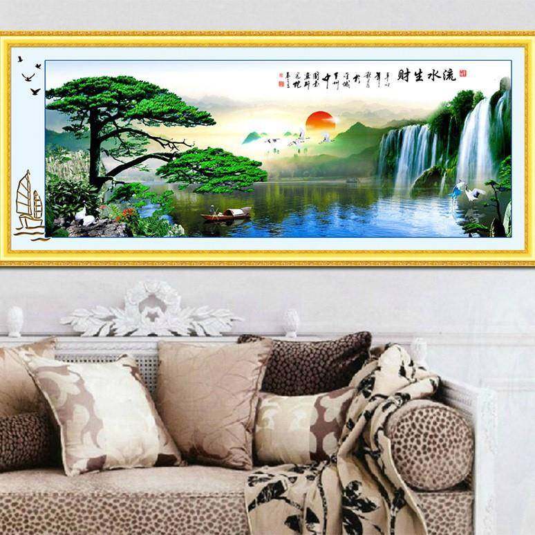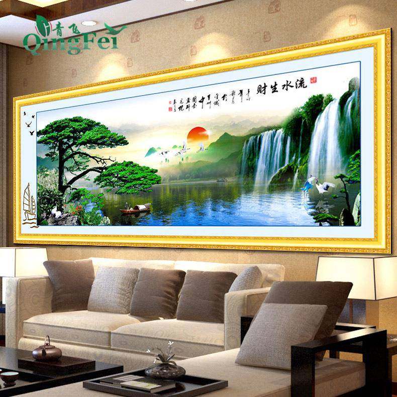 青飞精准印布流水生财财源滚滚十字绣迎客松聚宝盆客厅卧室挂画