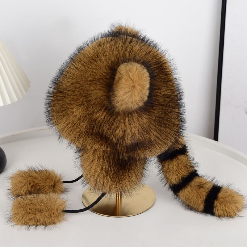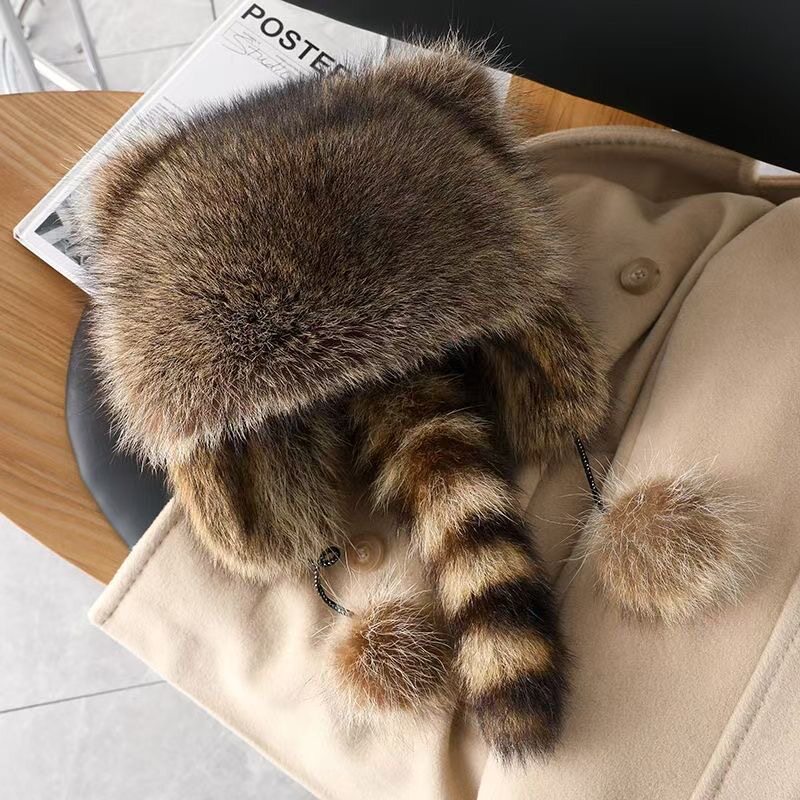 小浣熊儿童帽子护耳帽仿貉子毛雷锋霸王帽尾巴冬季保暖男女皮草
