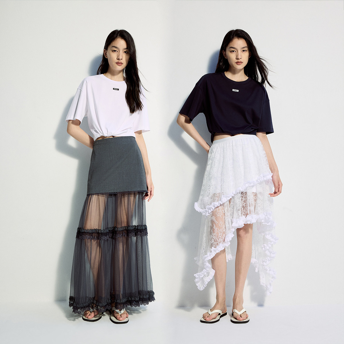 OCHIRLY欧时力 捏褶落肩短袖t恤女不规则上衣设计感夏新