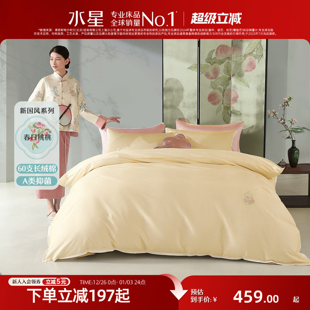水星家纺60支长绒棉四件套A类抑菌套件全棉贡缎新中式轻奢床品