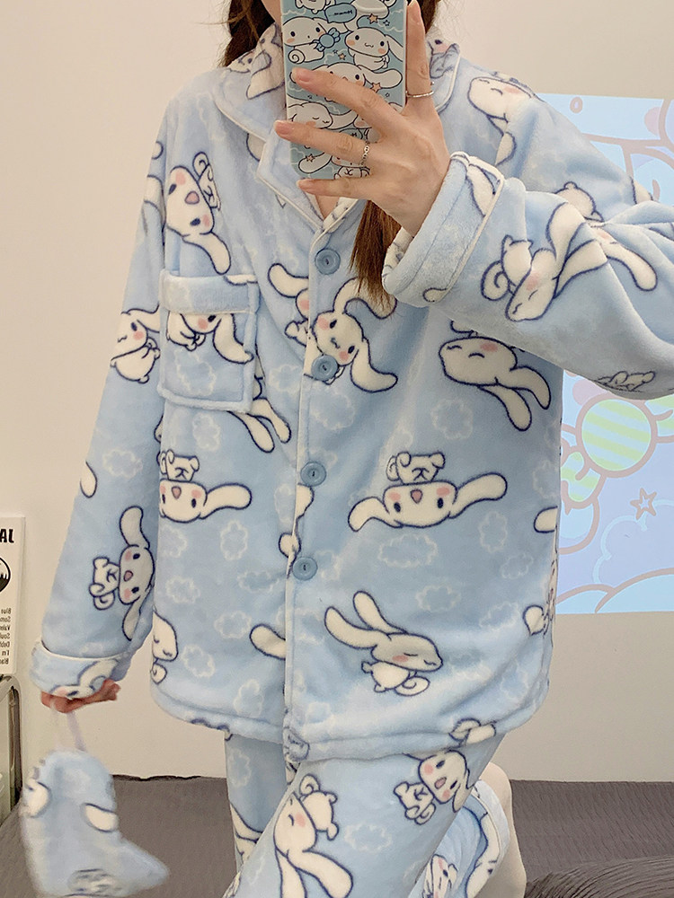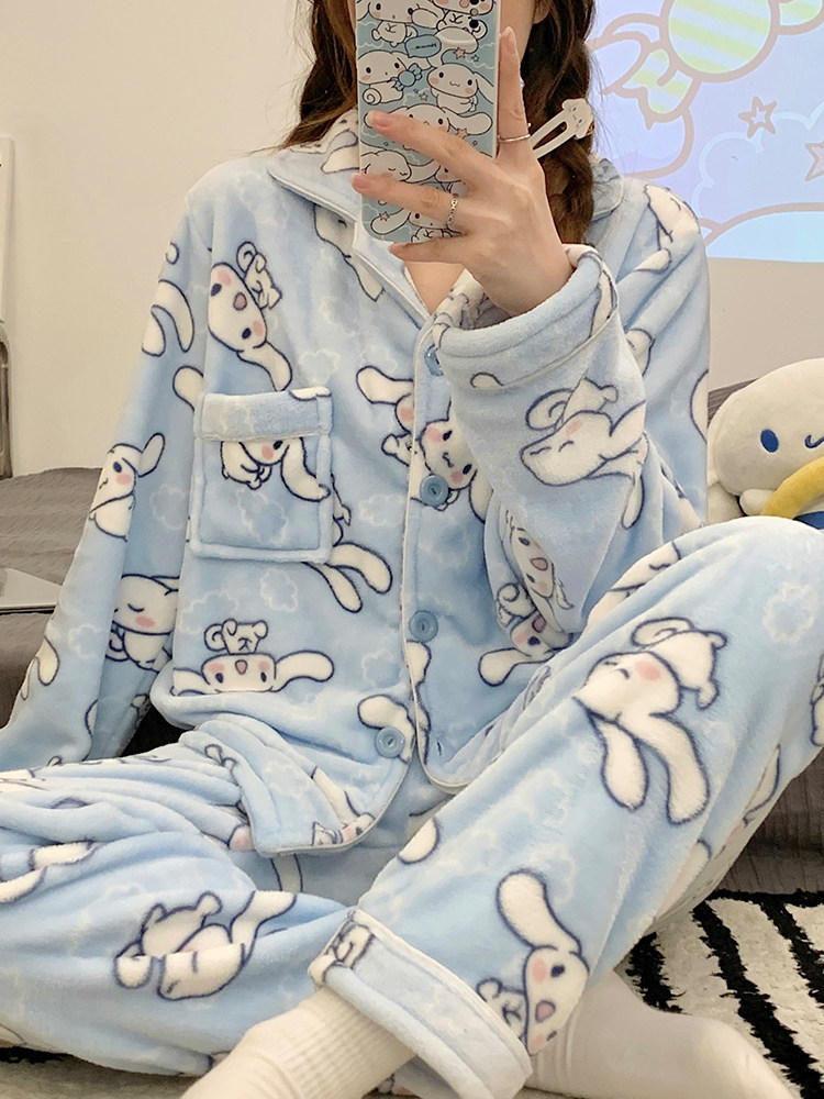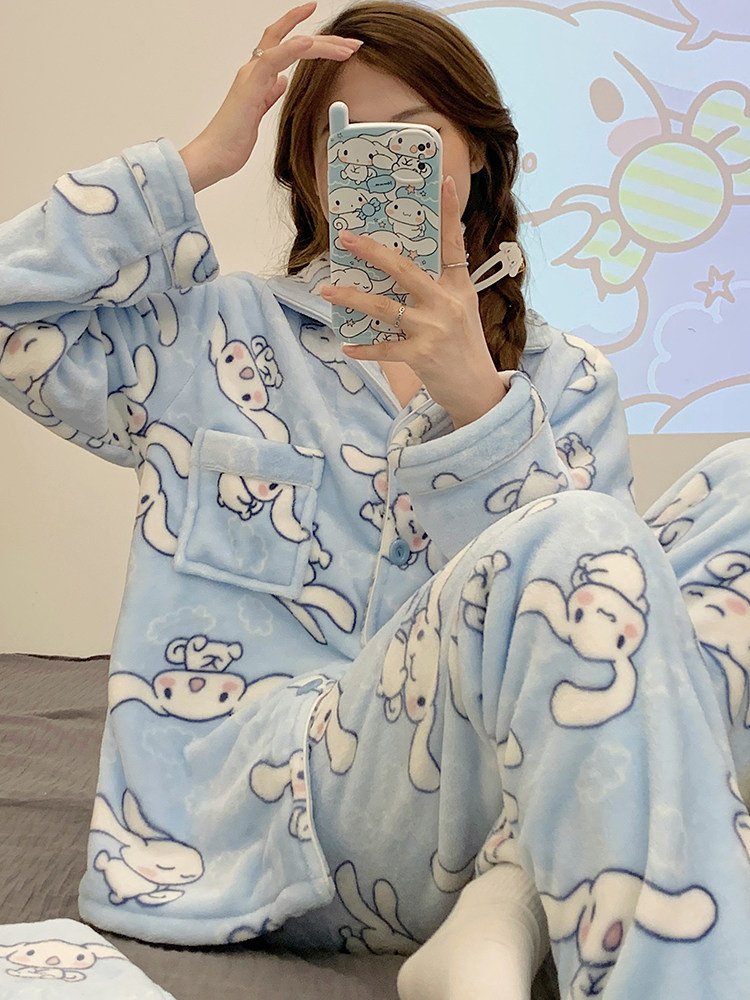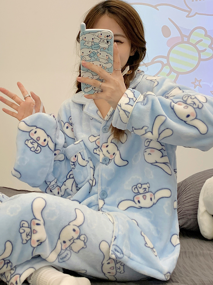 玉桂狗加绒加厚珊瑚绒睡衣女士秋冬季新款大耳狗法兰绒家居服套装