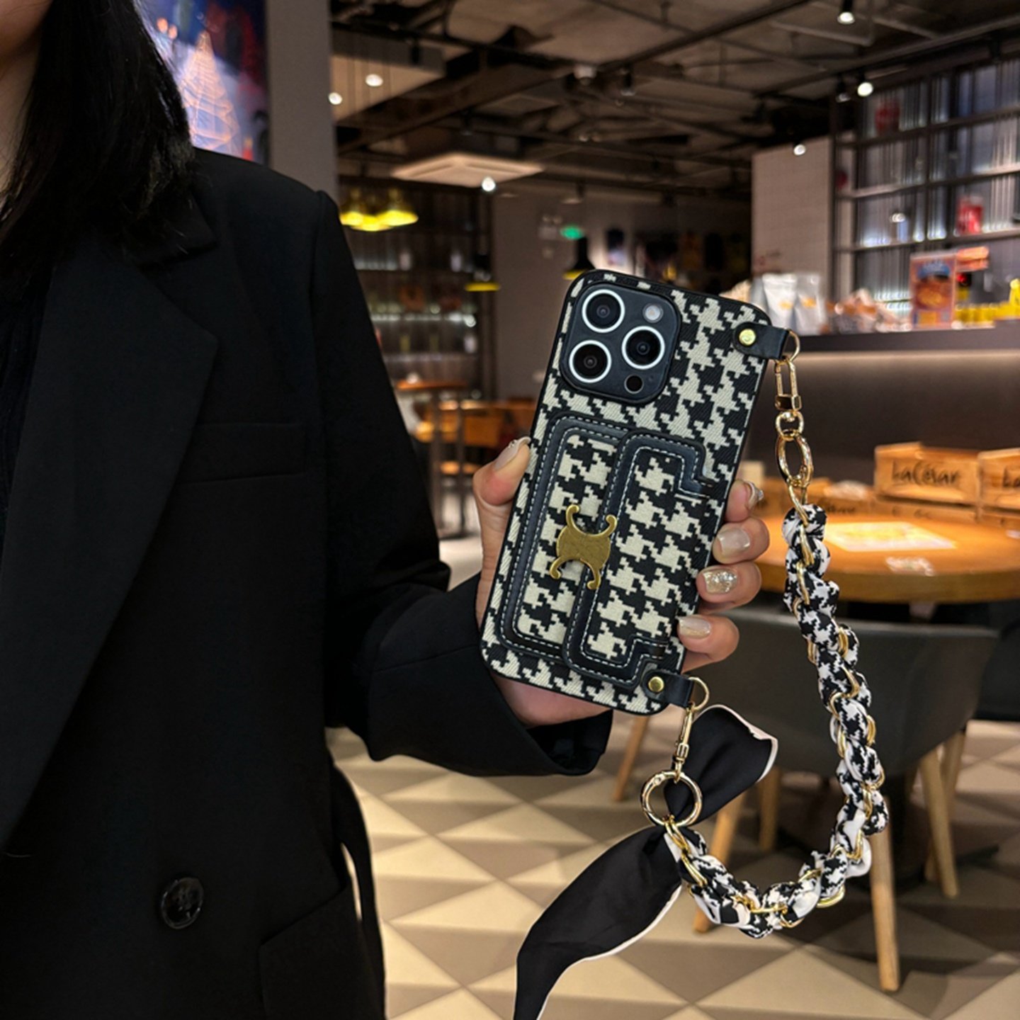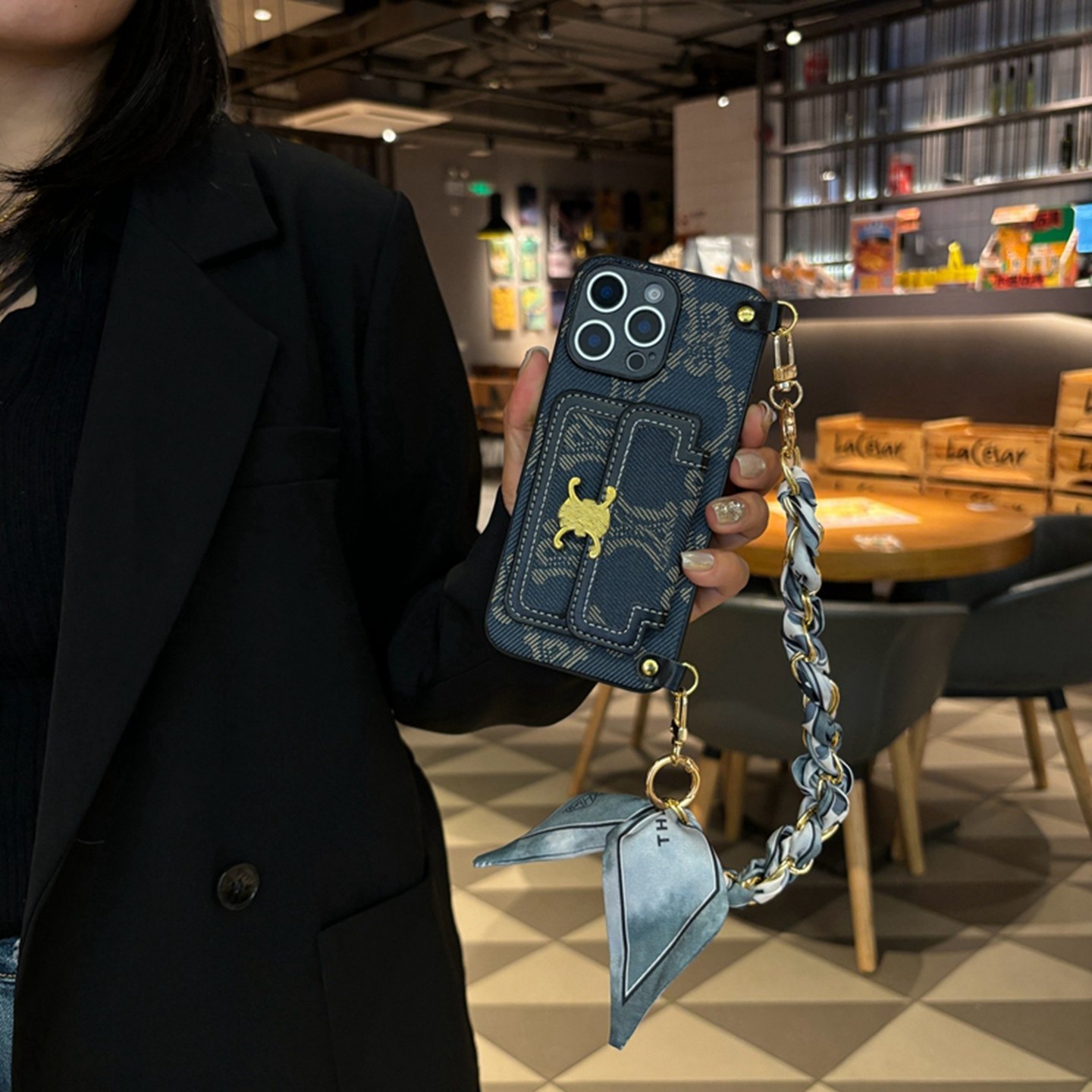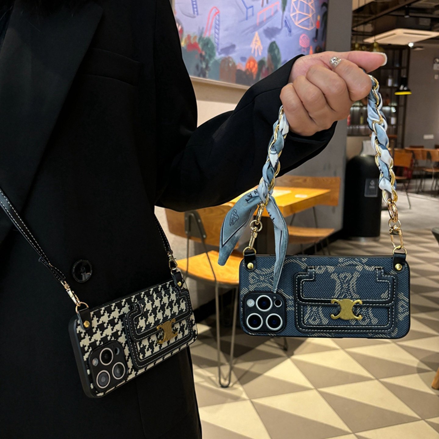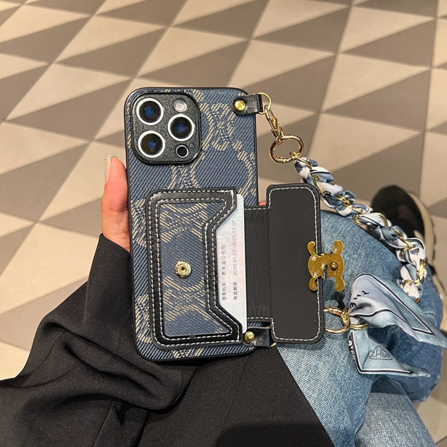 牛仔蓝横斜挎背带适用苹果16promax手机壳手提短绳iPhone15高级感13promax高档奢华14pro背包式17p挂绳12插卡