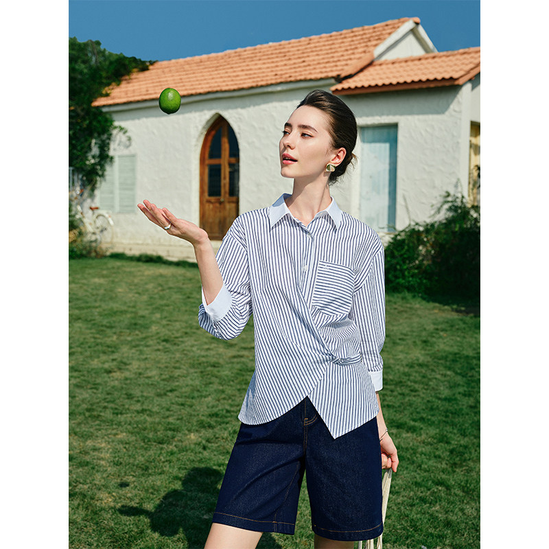 【纯棉】Navigare意大利小帆船蓝色女士工装衬衫休闲条纹衬衣