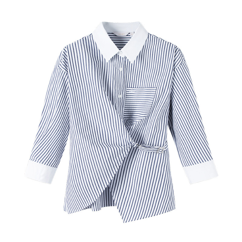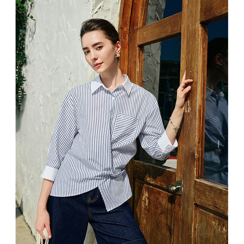 100棉|罗蒙春秋女士长袖衬衫竖条纹休闲百搭宽松衬衣女上衣外套