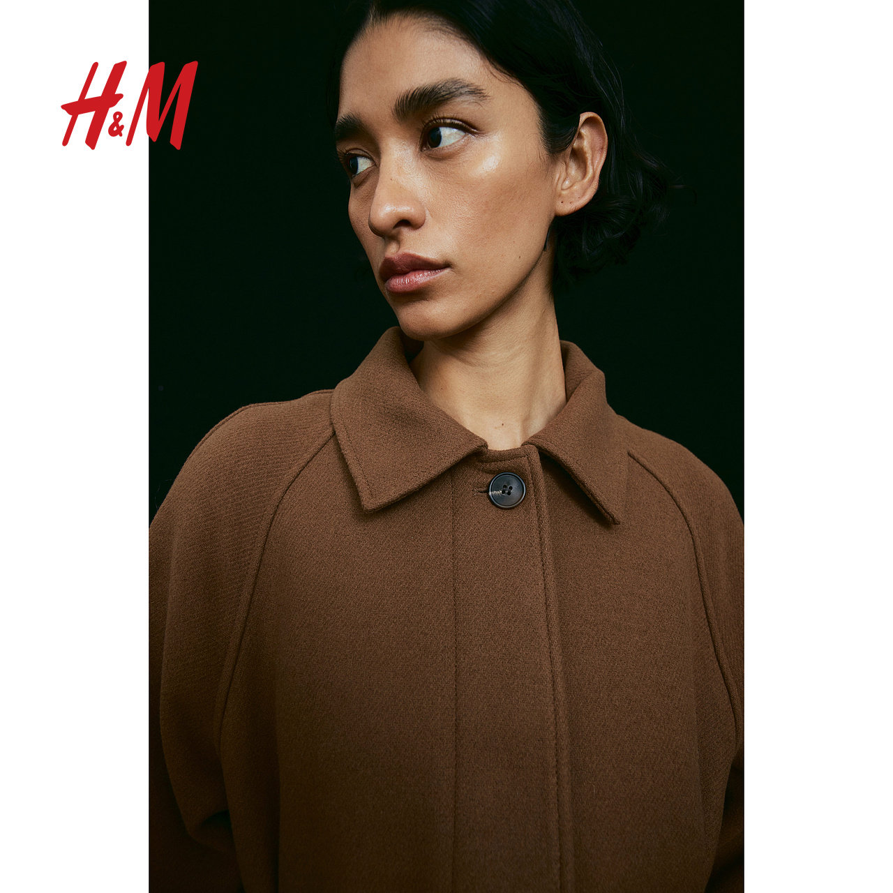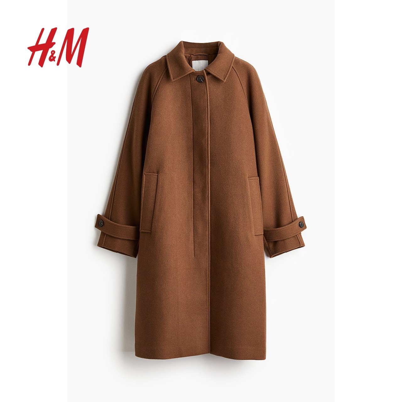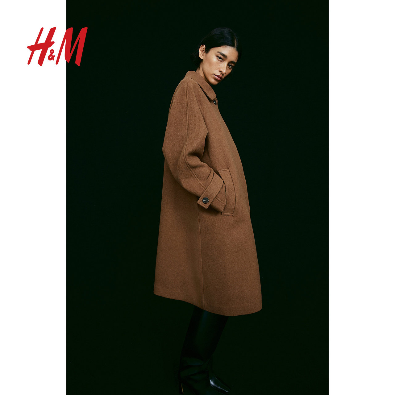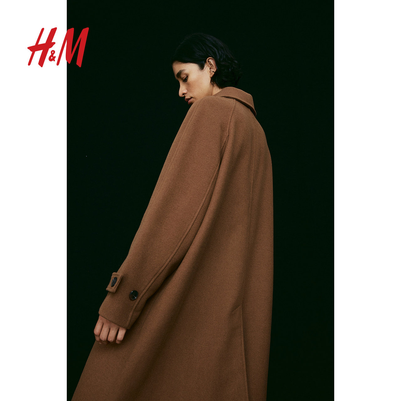 HM女装毛呢外套冬季时尚宽松简约时尚保暖及膝老钱风风衣1253843