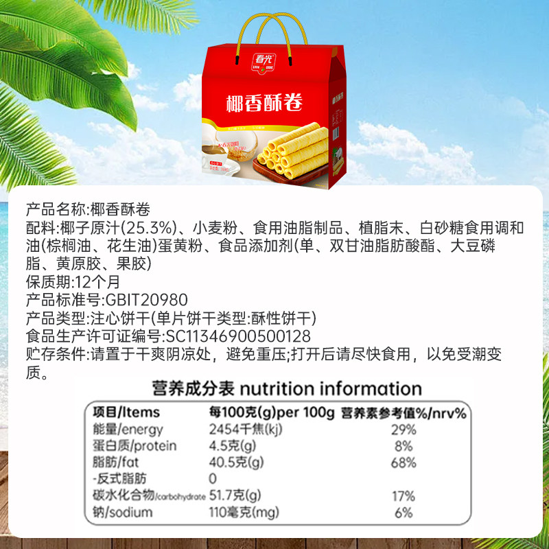 春光食品海南特产休闲零食椰奶夹心饼干椰香酥卷早餐代餐椰子榴莲