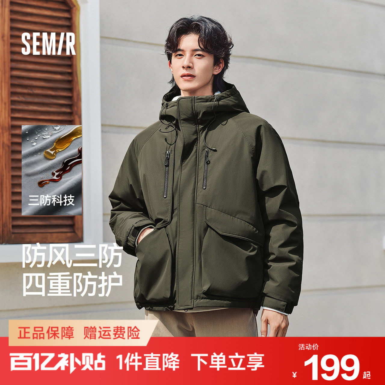 森马棉服男防风三防外套短款工装山系户外登山连帽上衣冬装轻薄款