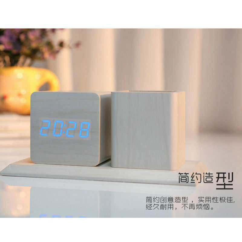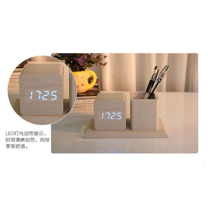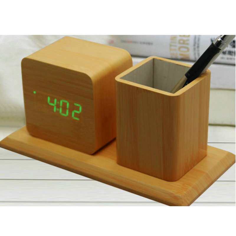 源头厂家创意笔筒 LED木钟 木头闹钟 木制笔筒 办公电子笔筒台钟